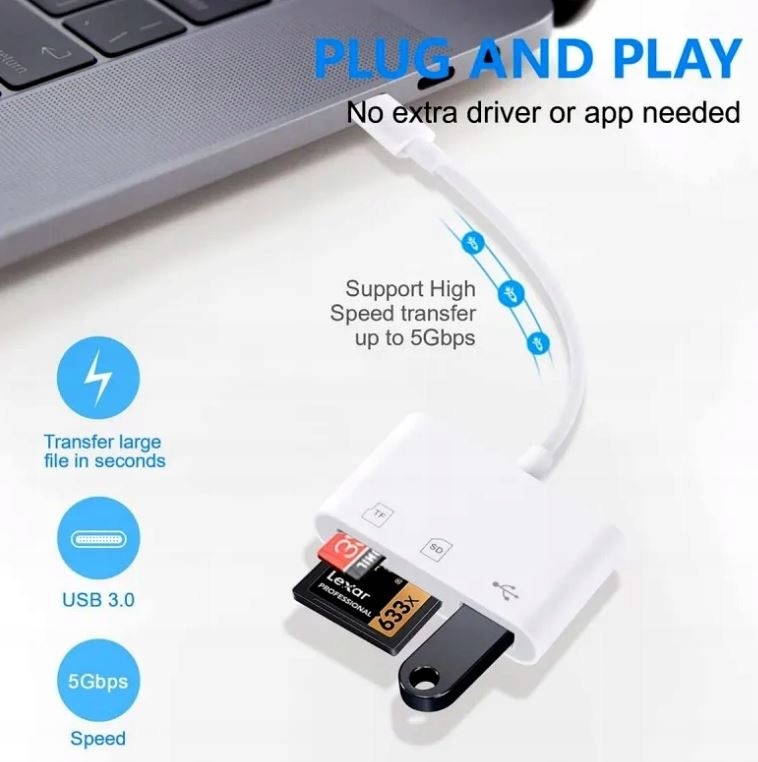 Przesyłaj zdjęcia plików między kartami SD/TF, urządzeniami pamięci USB do urządzeń USB-C bez wysiłku dzięki naszemu adapterowi.