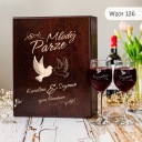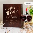 W skład kompletu wchodzi: drewniana skrzynka z grawerem + 2 sztuki kieliszków z grawerem.