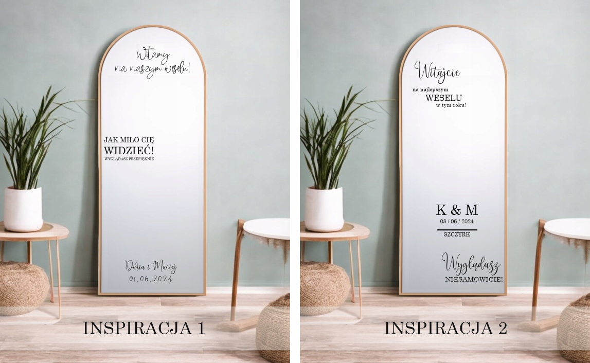 Pozwól swojej kreatywności rozwinąć się! Wybierz styl, czcionkę i kolor, który najlepiej odzwierciedla Twój osobisty gust i temat Twojego ślubu. Możliwości są nieograniczone! Nasze naklejki na lustro nie tylko dodają uroku, ale także elegancji. Dostępne w różnorodnych wzorach, kształtach i kolorach, z łatwością dopasują się do Twojego wyjątkowego stylu i tematu ślubu, tworząc niezapomniany efekt w Twojej przestrzeni ślubnej.