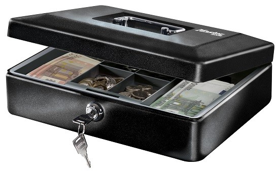Pudełko zamykane kasowe CB-12ML służy do przechowywania gotówki i ma solidną stalową konstrukcję. Wyjmowana taca z 8 przegródkami na monety, praktyczny uchwyt do noszenia i 2 klucze są zawarte w zestawie.