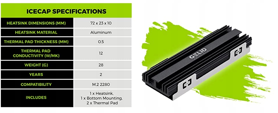IceCap został stworzony, aby chłodzić dysk SSD M.2 w dowolnym obciążeniu lub scenariuszu użytkowania, zwiększać wydajność dysku i wydłużać jego żywotność. Nowo zaprojektowany aluminiowy radiator, 2 wysokowydajne podkładki termiczne GP-Extreme i bezpieczny montaż zapewniają skuteczne odprowadzanie ciepła i pomagają utrzymać znacznie obniżoną temperaturę pracy SSD typu M.2. IceCap obsługuje najnowszy, wysokowydajny dysk SSD PCIe Gen 4 M.2 NVMe o pojemności do 4 TB i jest w pełni kompatybilny z gniazdem aktualizacji PS5 SSD. Spraw, by Twój dysk SSD był chłodny i szybki! Wyjaśnienie dławienia termicznego SSD: Thermal Throttling to technika, w której częstotliwość układu scalonego może być automatycznie dostosowywana w celu zmniejszenia ilości ciepła generowanego przez układ scalony. Normalnie podzespoły elektroniczne pracują z pełną prędkością w standardowym zakresie temperatur. Jednak w przypadku dużych obciążeń – podczas uruchamiania aplikacji, takich jak gry komputerowe, przetwarzanie wideo lub manipulacja danymi – kontroler SSD i układy pamięci IC mogą generować nadmierne ciepło ze względu na wysoką przepustowość danych. Aby schłodzić dysk SSD, stosowany jest automatyczny cykl pracy, efektywna częstotliwość spada, a temperatura robocza stopniowo osiąga normalny zakres. W tym cyklu wydajność dysku SSD spada, aż do obniżenia temperatury. IceCap znacznie poprawia chłodzenie dysku SSD. W związku z tym temperatura robocza staje się znacznie niższa, a dławienie termiczne nie jest uruchamiane przy dowolnym obciążeniu lub scenariuszu użytkowania.