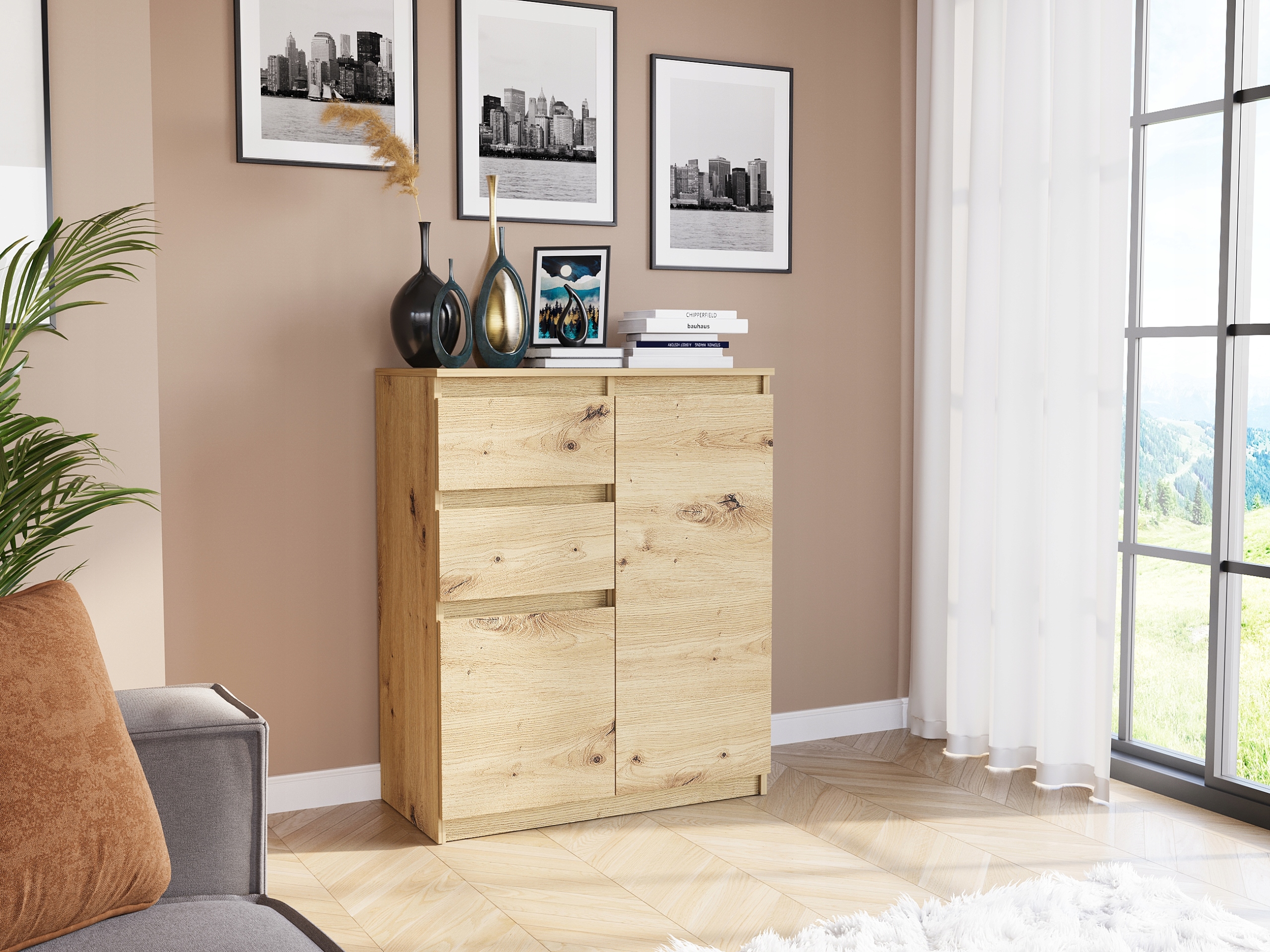 Nowoczesna komoda z linii MODERN, stworzony dla ludzi, którzy cenią sobie nowoczesny styl i elegancję.Odnowi wnętrze każdego salonu, biura czy pokoju młodzieżowego. Konstrukcja jest minimalistyczna, ale solidna i trwała. Ergonomiczne wymiary zapewniają swobodne umeblowanie pomieszczenia.
