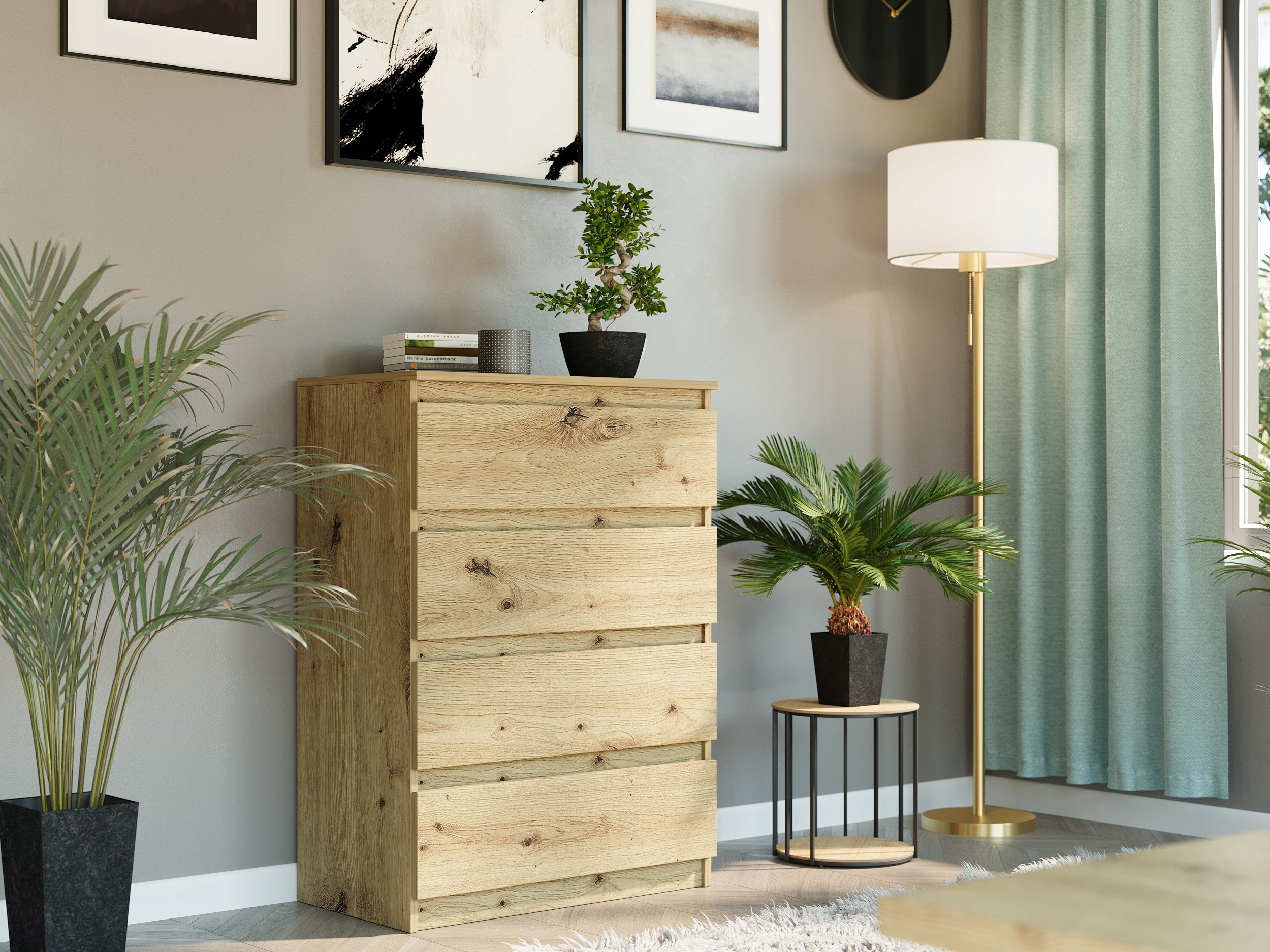 Stylowa komoda z kolekcji MODERN, stworzona dla ludzi, którzy cenią sobie nowoczesny styl i elegancję. Odnowi wnętrze każdej sypialni i salonu. Konstrukcja jest minimalistyczna ale solidna i trwała. Dzięki bezuchwytowym frontom szuflad komoda jest wygodna w użytkowaniu. Ergonomiczne wymiary komody zapewniają swobodę w umeblowaniu pomieszczenia.