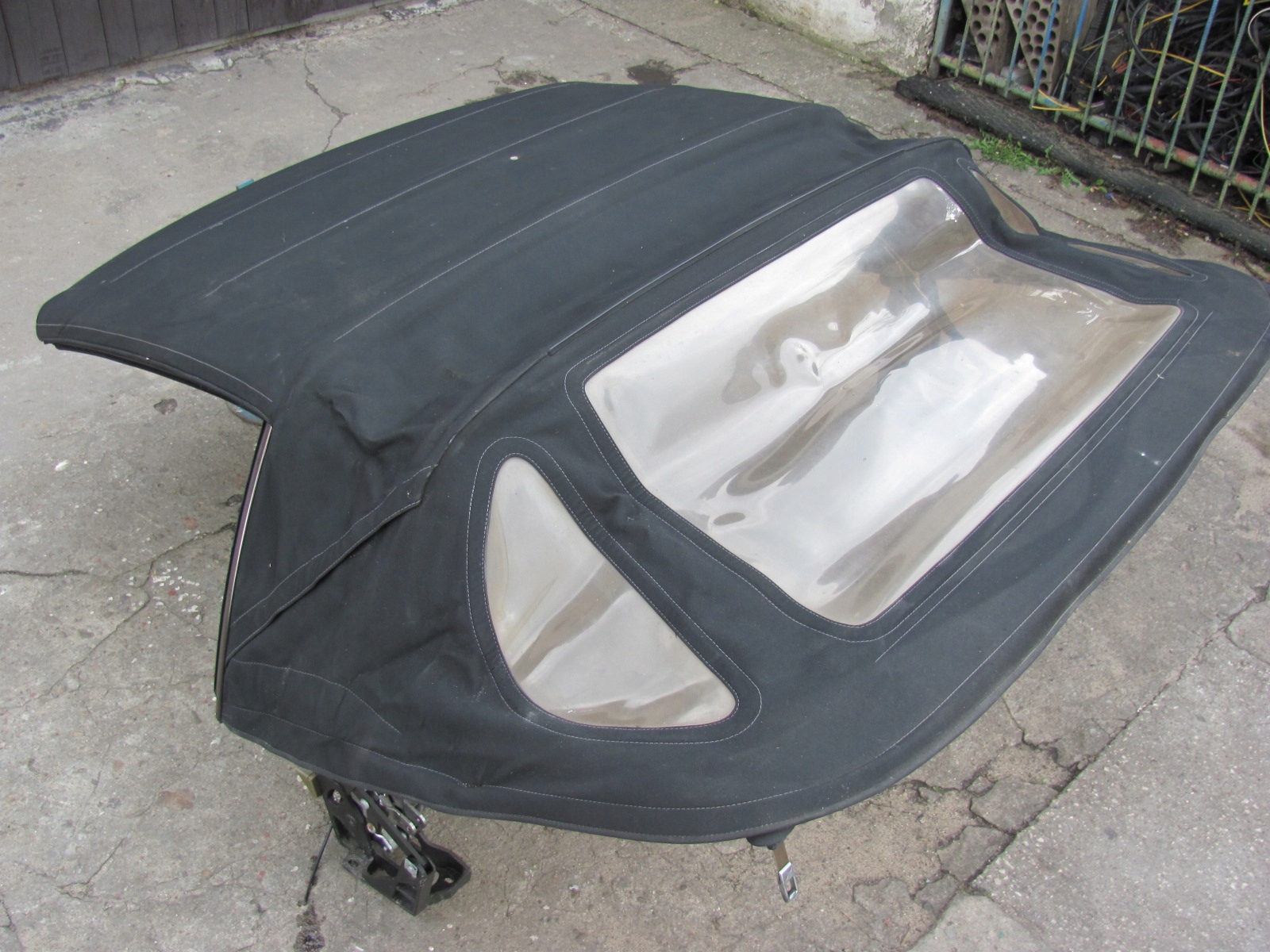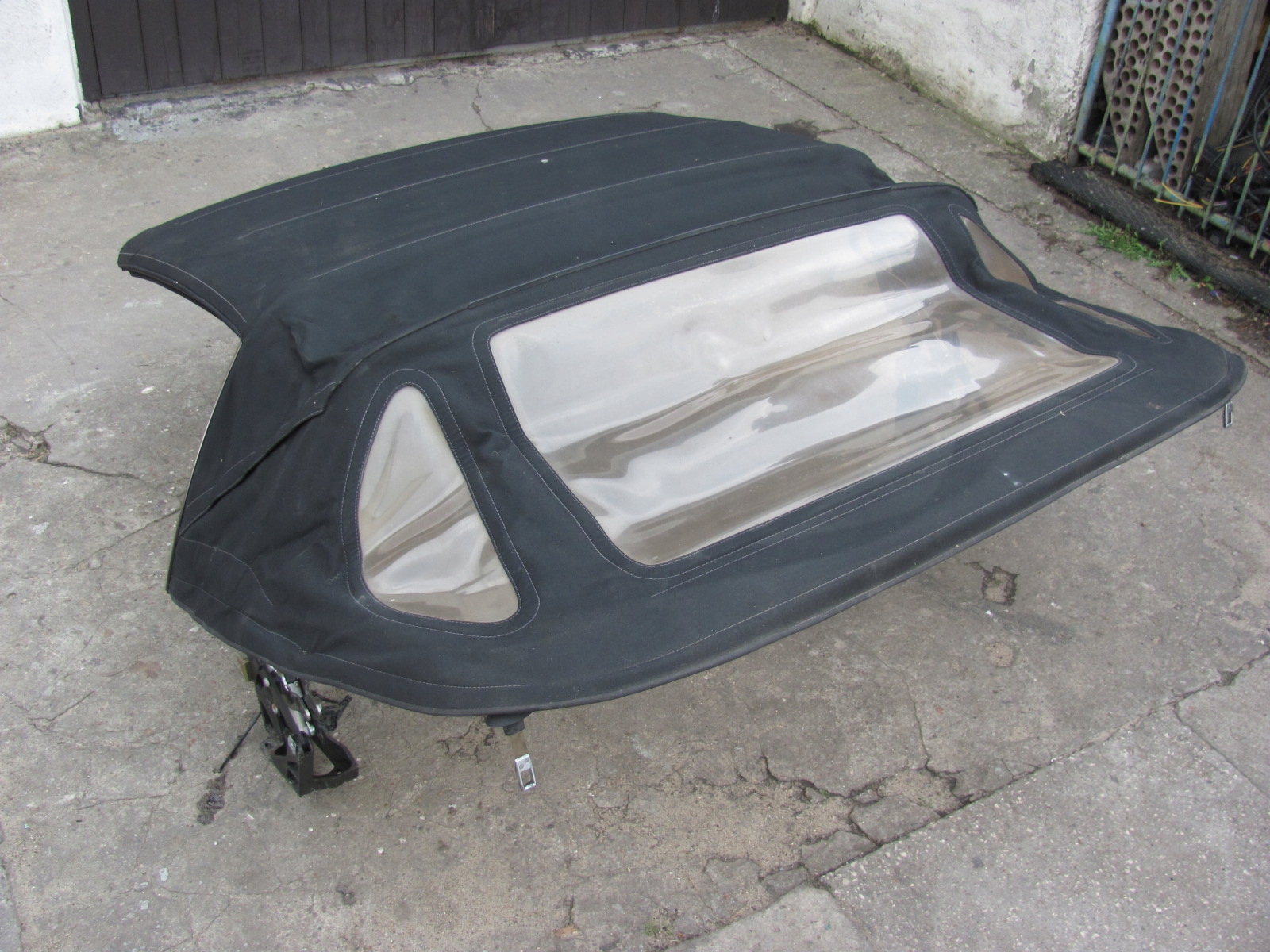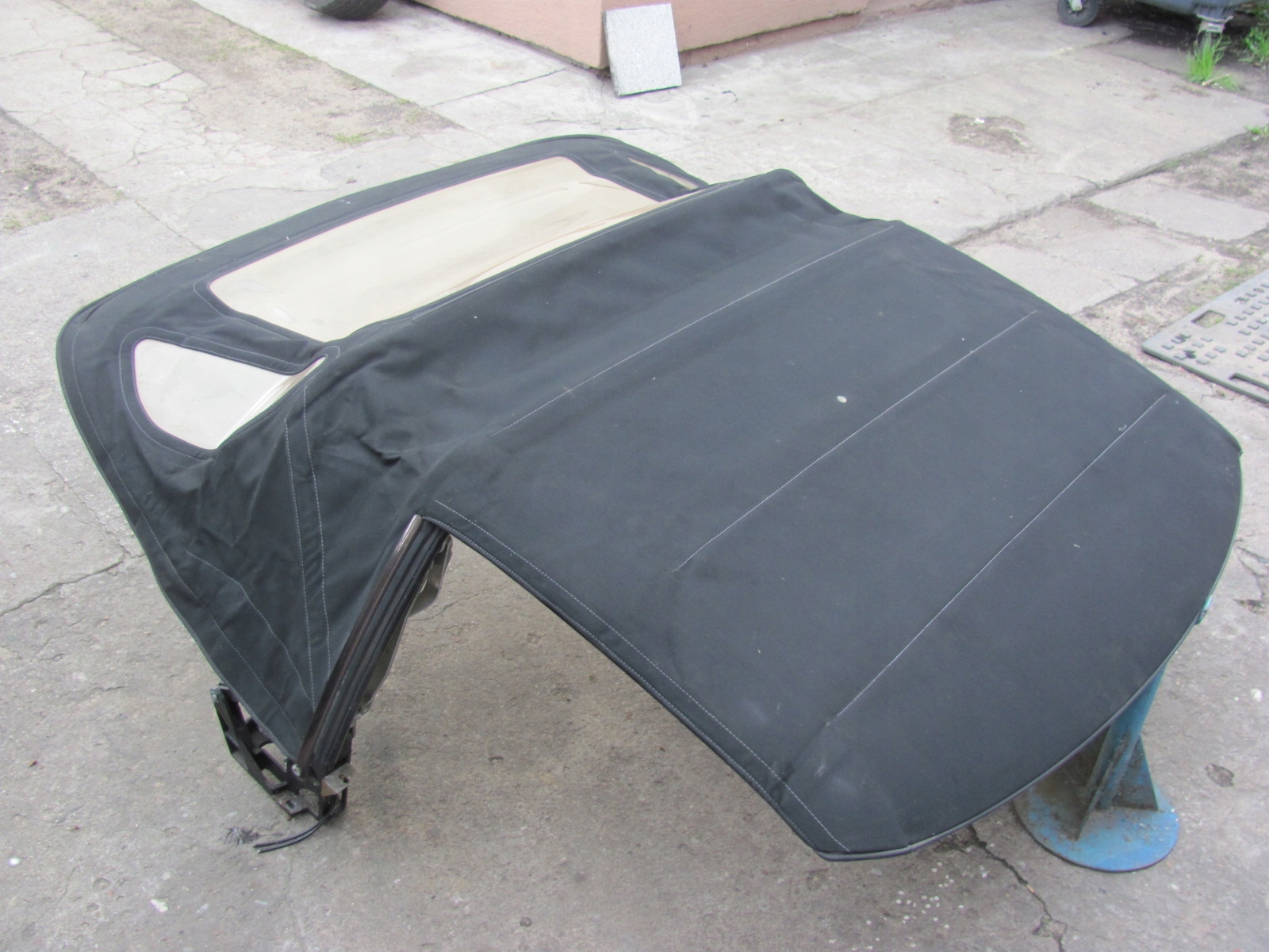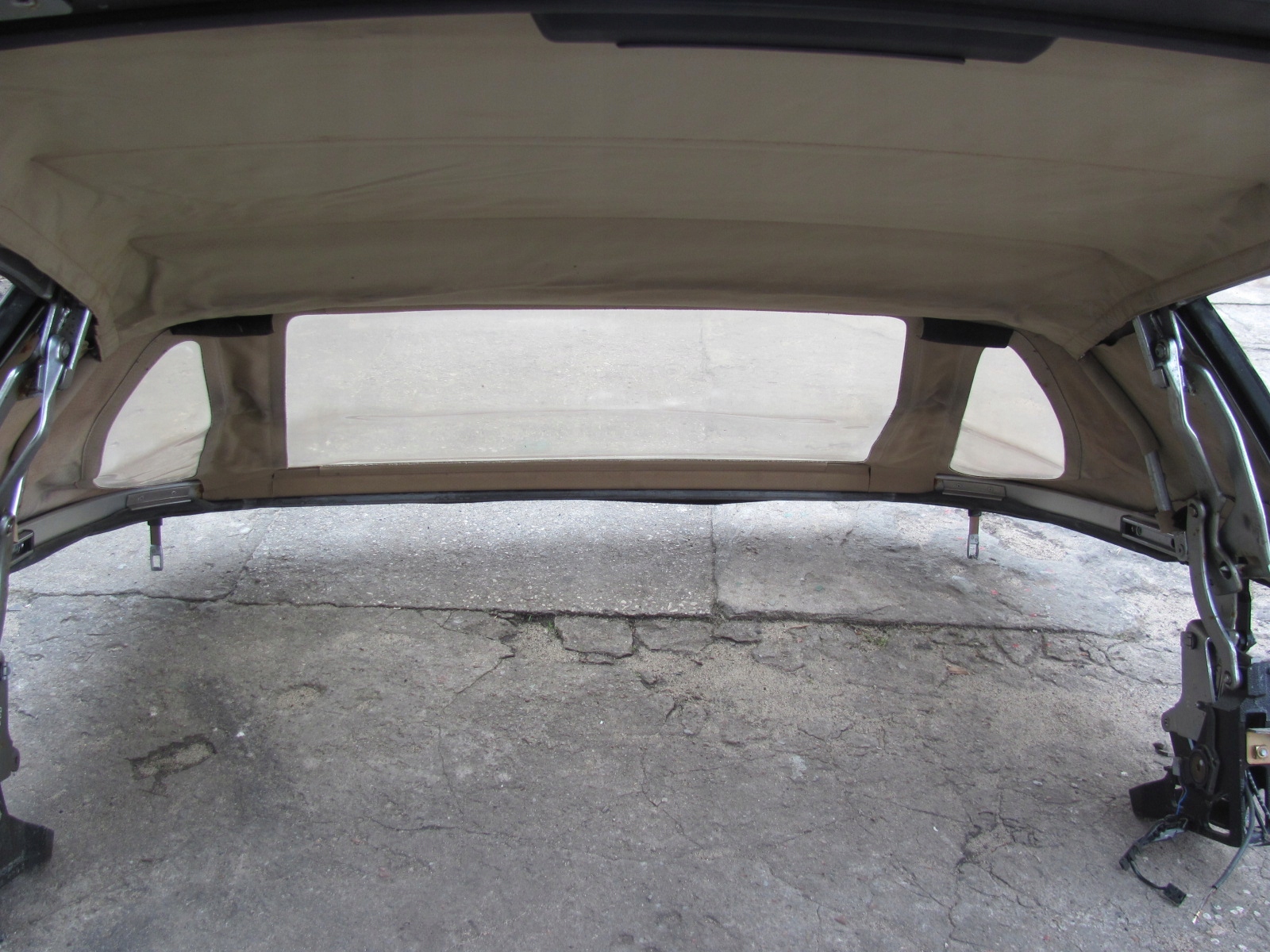 Uszkodzony materiał dachu i część podsufitki, brak wspornika wypychającego środek dachu, szyby nie oryginalne !!