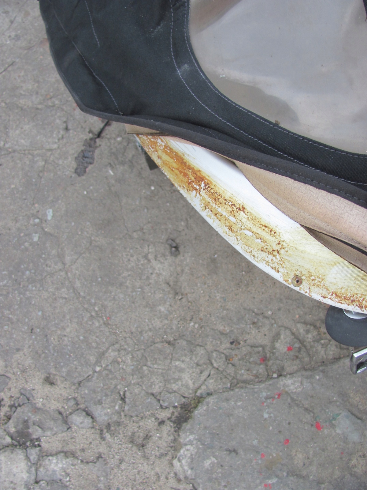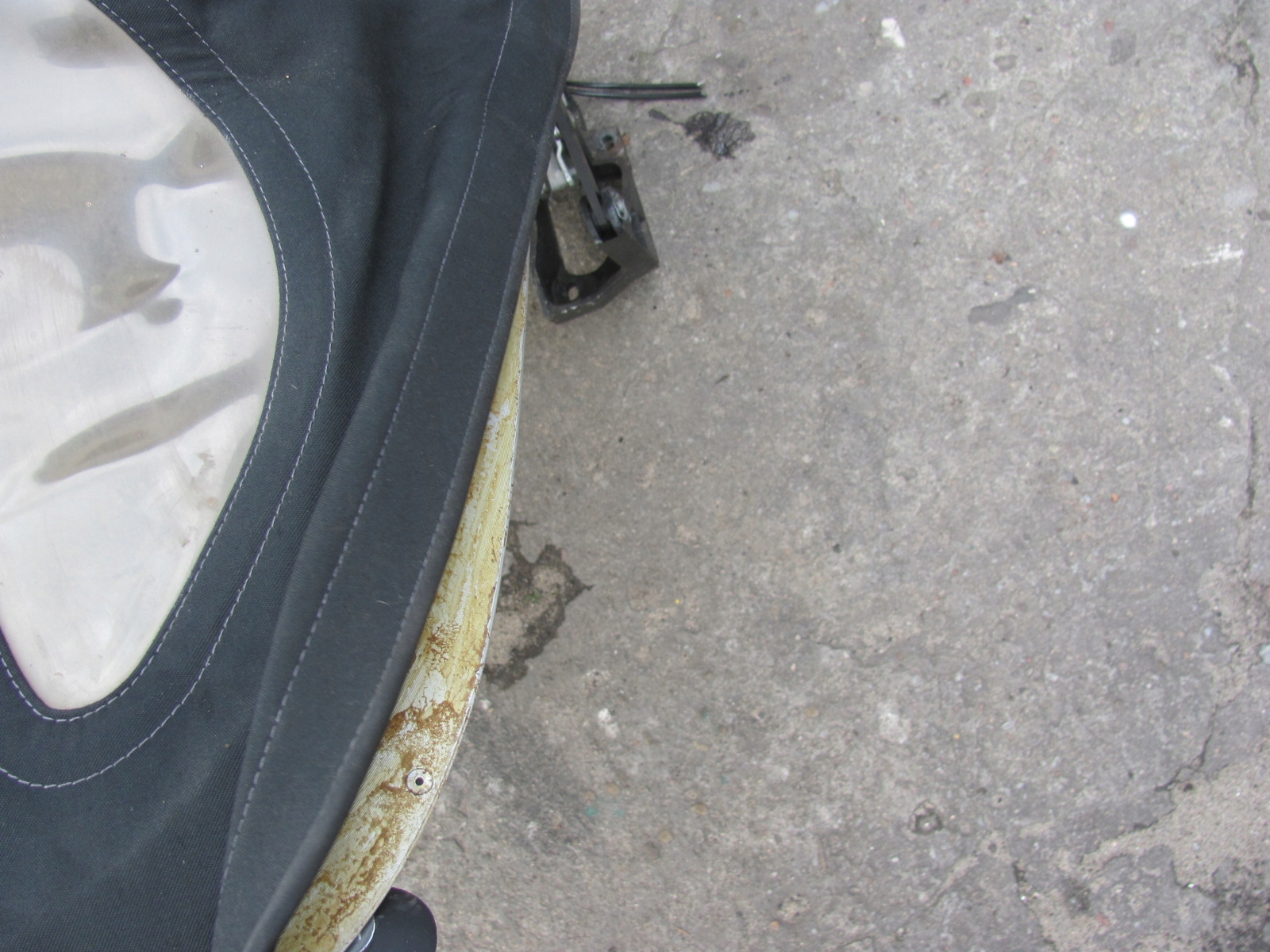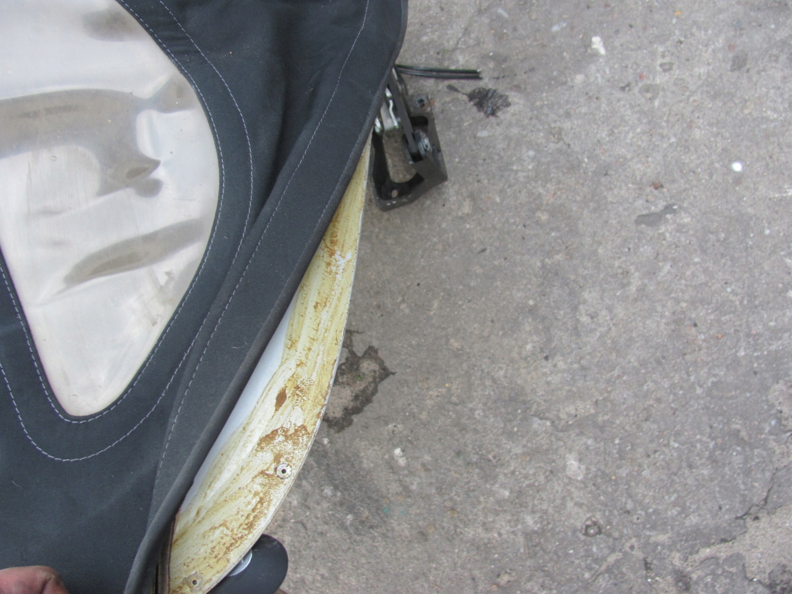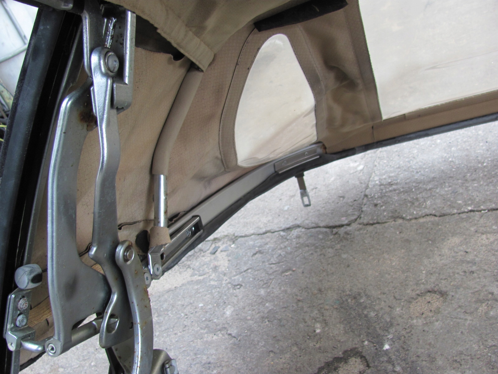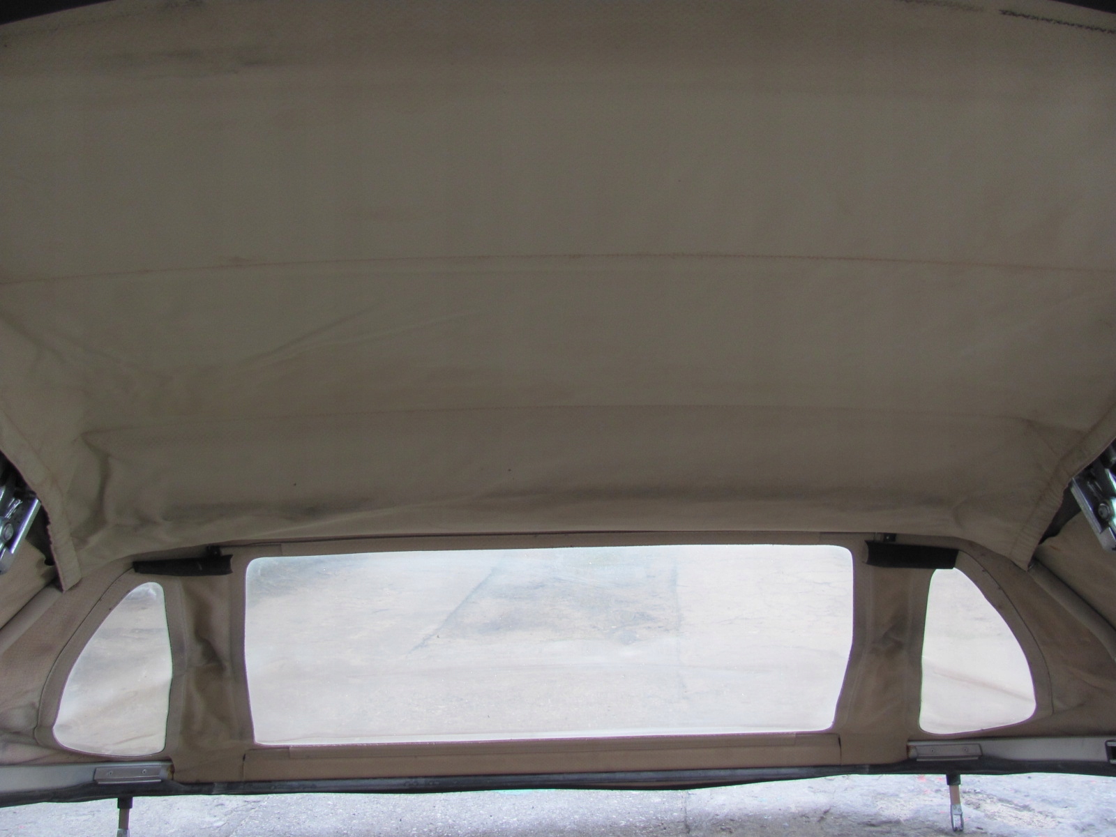 Uszkodzony materiał dachu i część podsufitki, brak wspornika wypychającego środek dachu, szyby nie oryginalne !!