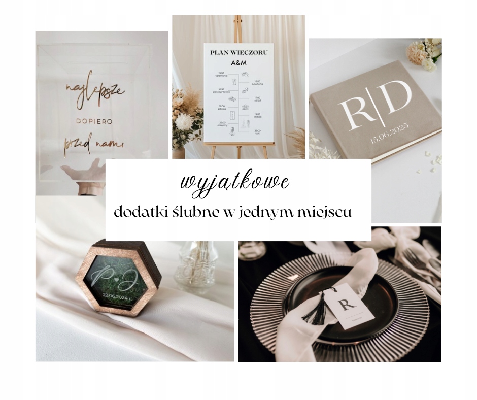 Jeśli interesują Cię spójne dodatki ślubne, chcesz je zamówić w jednym miejscu i mieć pewność, że wykonane są z największą starannością, zapraszamy Cię na nasze pozostałe aukcje. Tworzymy wyjątkowe dodatku takie jak tablice powitalne, zestawy skrzynek, pudełek na obrączki, plany stołów i winietki - wszystko dopasowane do wymarzonego przez Ciebie stylu wesela.