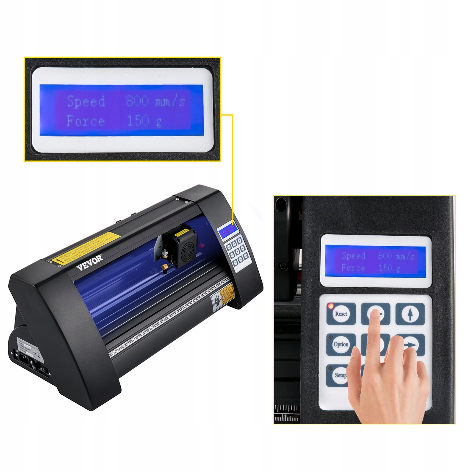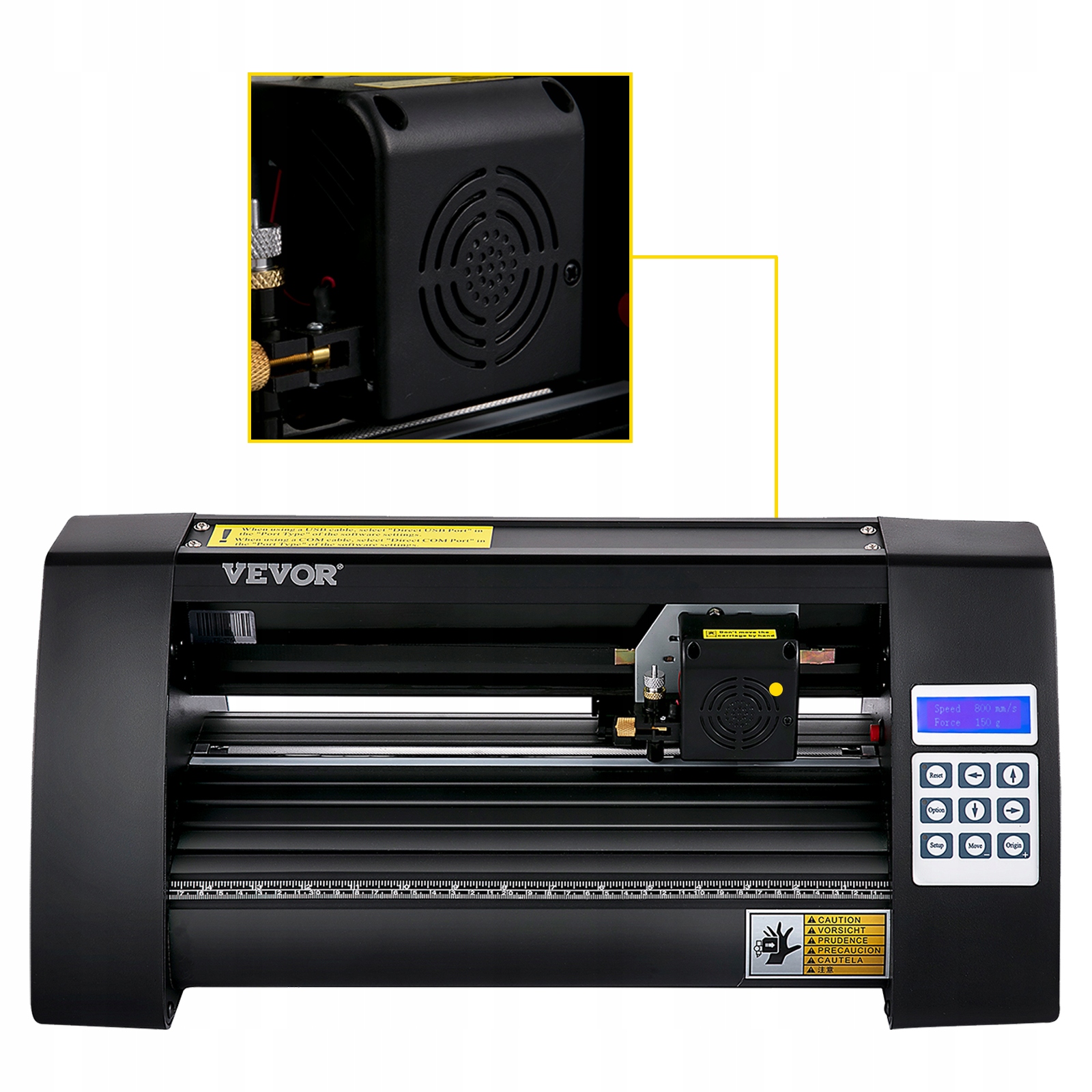 Maszyna do cięcia winylu jest wyposażona w wyświetlacz z podświetleniem, aby jeszcze bardziej zwiększyć przejrzystość i jasność. Przyjdź z intuicyjnym panelem cyfrowym do monitorowania jakości cięcia od czasu do czasu. Zapewnia prędkość cięcia 800 mm/s oraz siłę cięcia 500 g.