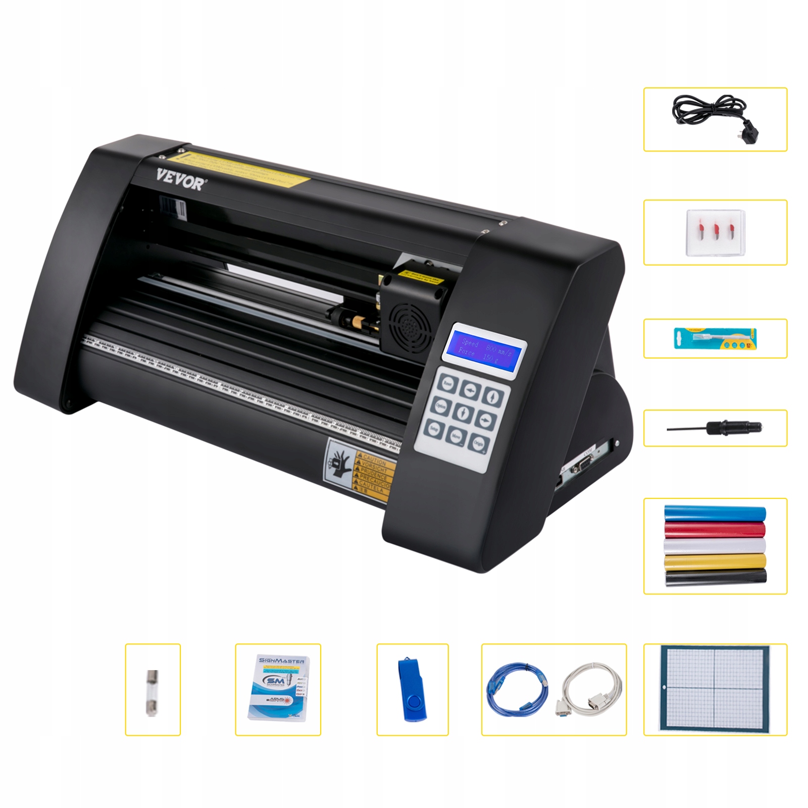 Ten ploter do wycinania znaków zawiera kompletne akcesoria dla lepszego wykorzystania, takie jak pamięć USB wraz z instrukcją instalacji i obsługi, 5 arkuszy winylowych, mata do cięcia i wymienne ostrza. Oferuje również bezpiecznik posiadający funkcję zatrzymania awaryjnego, aby zapobiec niebezpieczeństwu.