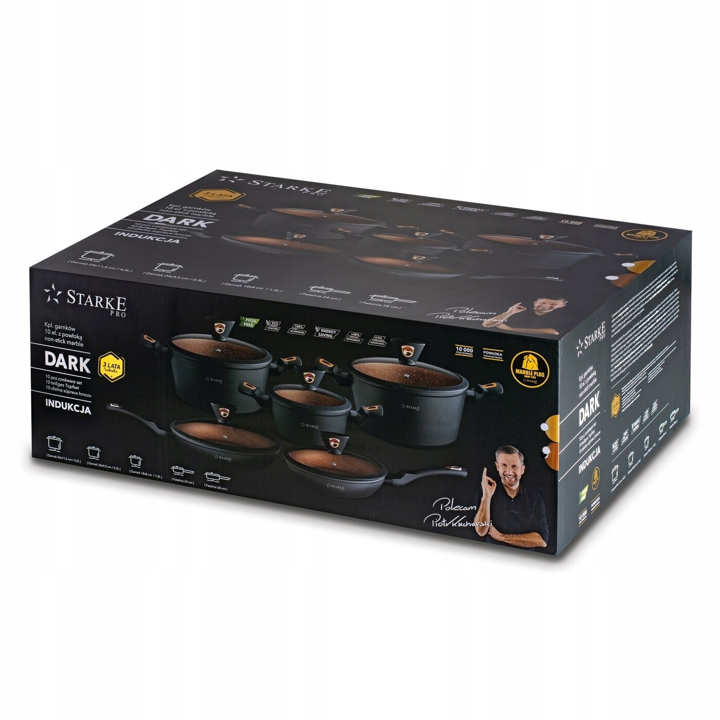 Антипригарная индукционная кастрюля с крышками Starke Pro Dark Copper 10 штук он алюминиевый, имеет толстые стенки и защищает пищу от прилипания. Тип корпуса, который он использует, горячей штамповки из одного листа металла с техникой forged. Благодаря этому 3 горшка и 2 кастрюли-24 и 28 см-очень прочные и хорошо проводят тепло. Они также великолепны сбалансированный, который в сочетании с не нагревающимися и нескользящими ручками soft touch даст вам высокий уровень комфорта пользователя. Набор работает на любом типе плиты, потому что он использует дно индукционная толщина 3,2 мм. Это делает приготовление пищи быстрее, и при этом энергосберегающие. Долговечность внутренней поверхности посуды из коллекции Dark основана на трехслойное мраморное покрытие non-stick MARBLE PLUS (толщина 35-43 микрометра). Не содержит вредных веществ (например, ПФОК), является твердым, характеризуется отличной адгезией и с естественной текстурой и может выдерживать до 10 000 циклов истирания. Это также облегчает уход (не для посудомоечные машины, только ручная стирка). В комплекте вы также получаете 5 стеклянных крышек, посвященных - я не знаю, что делать. С их помощью вы можете тушить пищу и удобно регулировать количество водяного паравнутри кастрюль или сковородок. Серия Starke Pro Dark Copper с каменным гранитным покрытием была также тестируется профессиональным шеф-поваром Петром поварским. Он рекомендует ее на многолетний использование на домашней кухне.