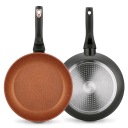 Pozostałe informacje: - garnki i patelnie z kutego aluminium pokryte powłoką Marble Plus posiadającą naturalną chropowatą teksturę o wysokiej przyczepności i doskonałej odporności na ścieranie i zarysowania, - powłoka trzywarstwowa, w kolorze miedzi z błyszczącymi drobinkami, - 10 000 cykli ścierania, - grubość dna: 3,2 mm, - grubość ścianki: 2,0 - 2,8 mm, - grubość brzegu: 4 mm, - antypoślizgowe uchwyty soft touch, bakelitowe pokryte powłoką silikonową, - PFOA free, - pokrywa szklana z silikonowym rantem i odpowietrznikiem wykończonym stalą nierdzewną, - nie nadaje się do zmywarki
