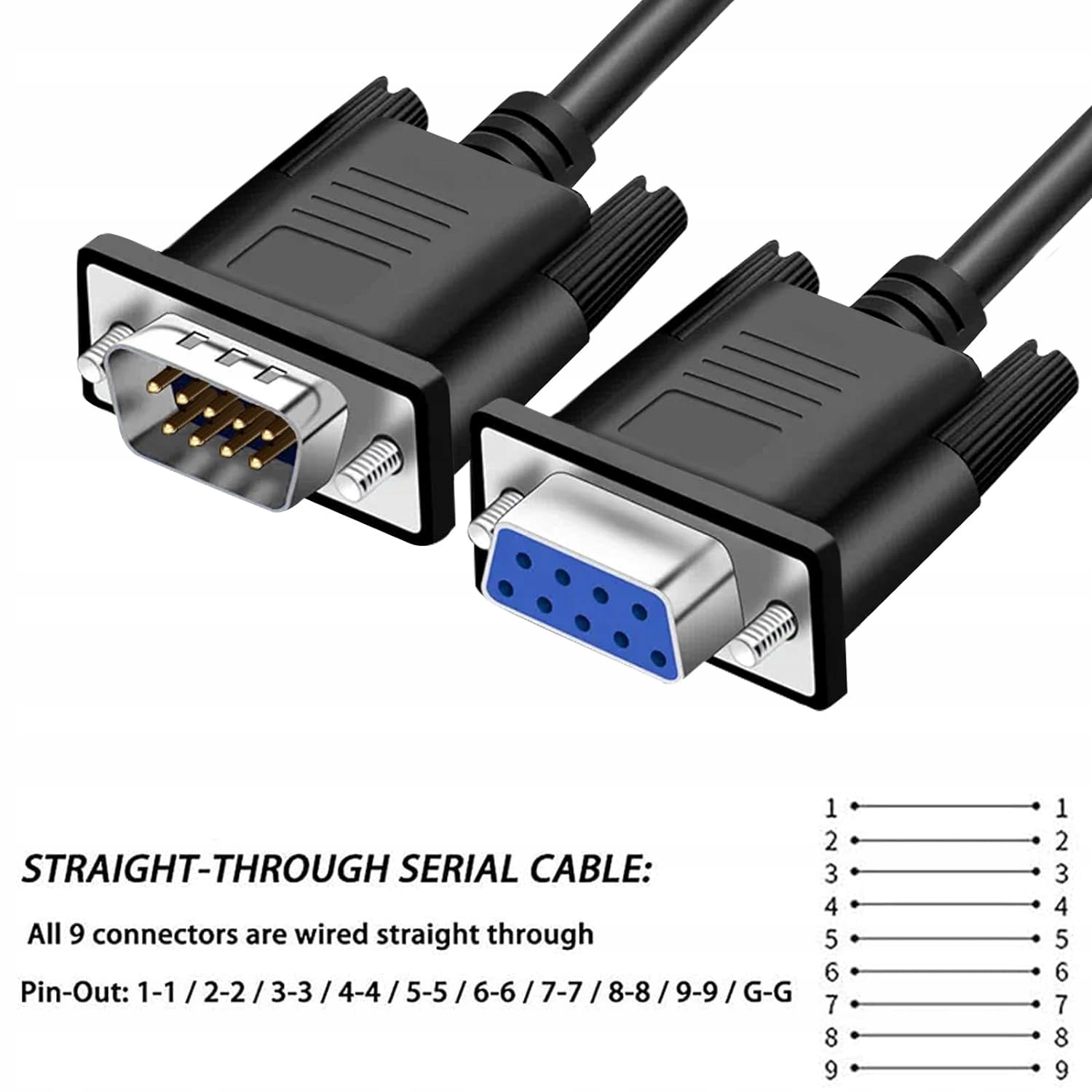 Длинный COM-порт RS232 экранирован пленкой AL, и все 9 контактов подключены прямо через пин-к-пин (распиновка: 1-1, 2-2, 3-3, 4-4,......, 8-8, 9-9, гг)