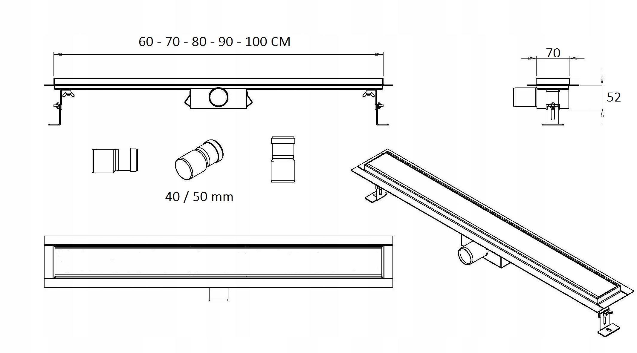 Odpływ liniowy PRZYŚCIENNY SANITLINE 2w1 do wypełnienia płytką lub po odwróceniu gładki ( stal szczotkowana ) syfon niski wysokość 52mm