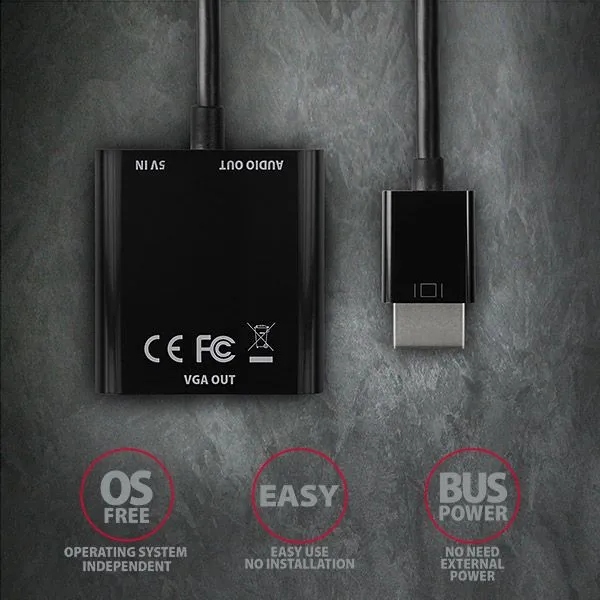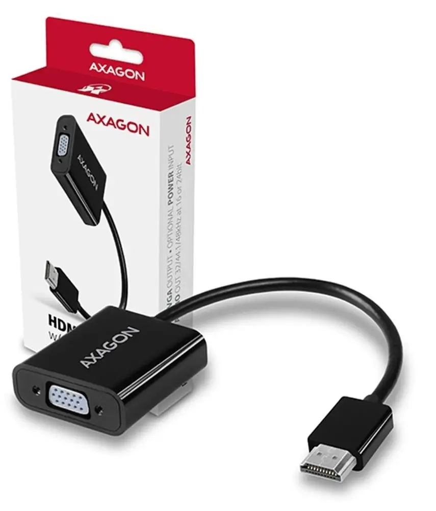 Aktywny adapter HDMI - > VGA AXAGON RVH-VGAN z wyjściem audio do podłączenia starszego monitora VGA / telewizora / projektora do komputera lub innego urządzenia z wyjściem HDMI. Można go również używać z przystawkami STB lub konsolami Xbox i PlayStation.