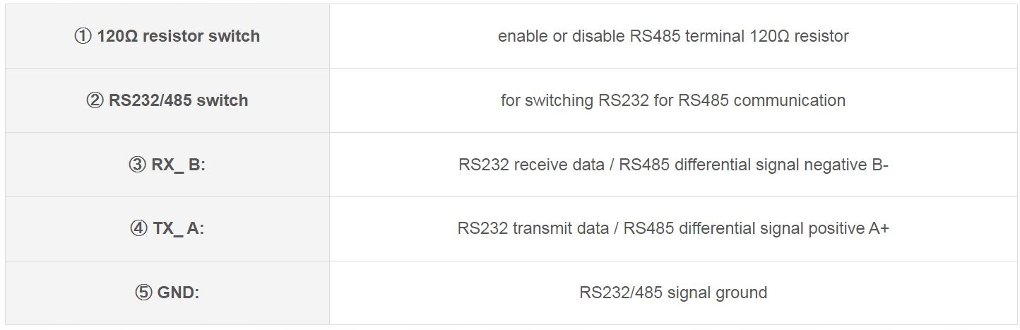 • Posiada obwód przełączający komunikację RS232/485, który można skonfigurować za pomocą przełącznika.