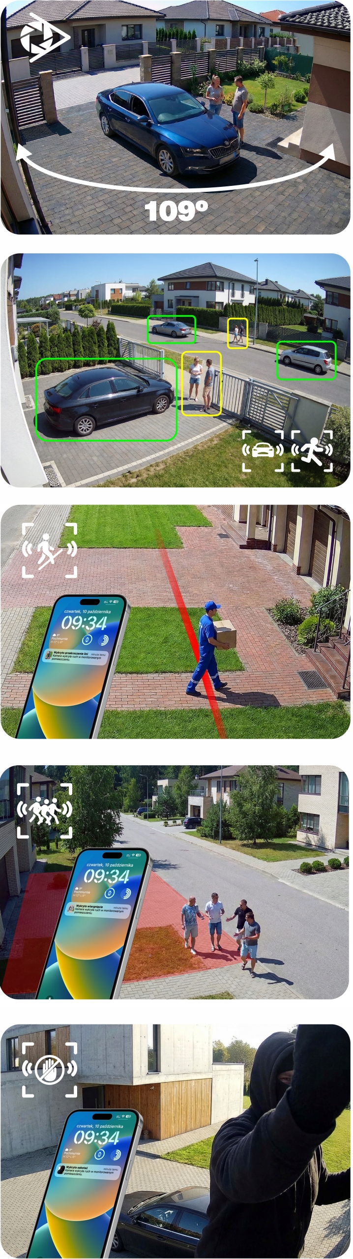 Zastosowana w kamerach zaawansowana analiza obrazu AI pozwala na precyzyjne rozróżnianie sylwetek ludzi oraz pojazdów, eliminując fałszywe alarmy wywołane przez zwierzęta, deszcz czy poruszające się gałęzie.