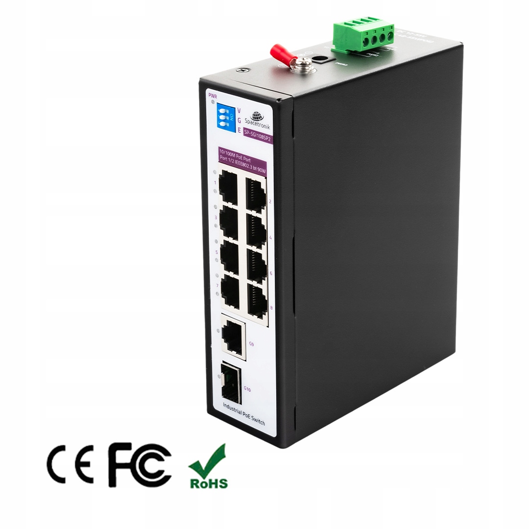 10 portowy SWITCH Spacetronik 8x port POE 10/100Mbps (w tym 2x port 90W) + 1x Uplink Ethernet port RJ45 1Gbps + 1x SFP port 1Gbps SP-SGI108SP2