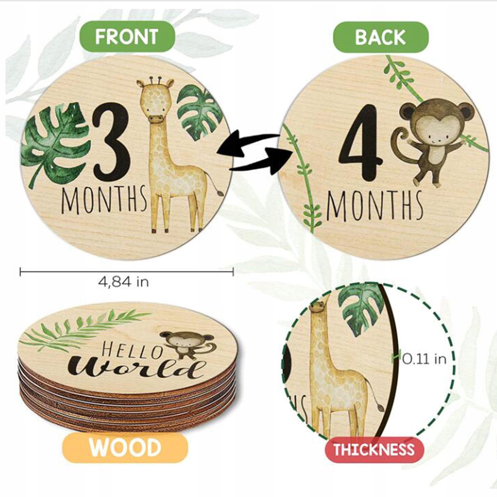 [Karty z miesięcznymi kamieniami milowymi dziecka]: Drewniane karty z kamieniami milowymi są wygrawerowane w kółkach, aby oznaczyć miesięczne kamienie milowe i znaki ogłoszenia narodzin dziecka wpływające na jego rozwój.