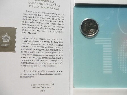 NA AUKCJI WYSTAWIANA JEST PRZEPIĘKNA MONETA OKOLICZNOŚCIOWA - 2 EURO SAN MARINO 2016 - 550 ROCZNICA ŚMIERCI - RZEŹBIARZ DONATELLO - MENNICZA - BARDZO RZADKA NAKŁAD TYLKO 85 TYS. SZTUK - RARYTAS + ETUI + CERTYFIKAT AUTENTYCZNOŚCI - NA INNYCH AUKCJACH WYSTAWIAM DUŻO RZADKICH MONET EURO z RÓŻNYCH KRAJÓW - ZAPRASZAM DO OBEJRZENIA