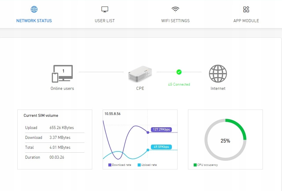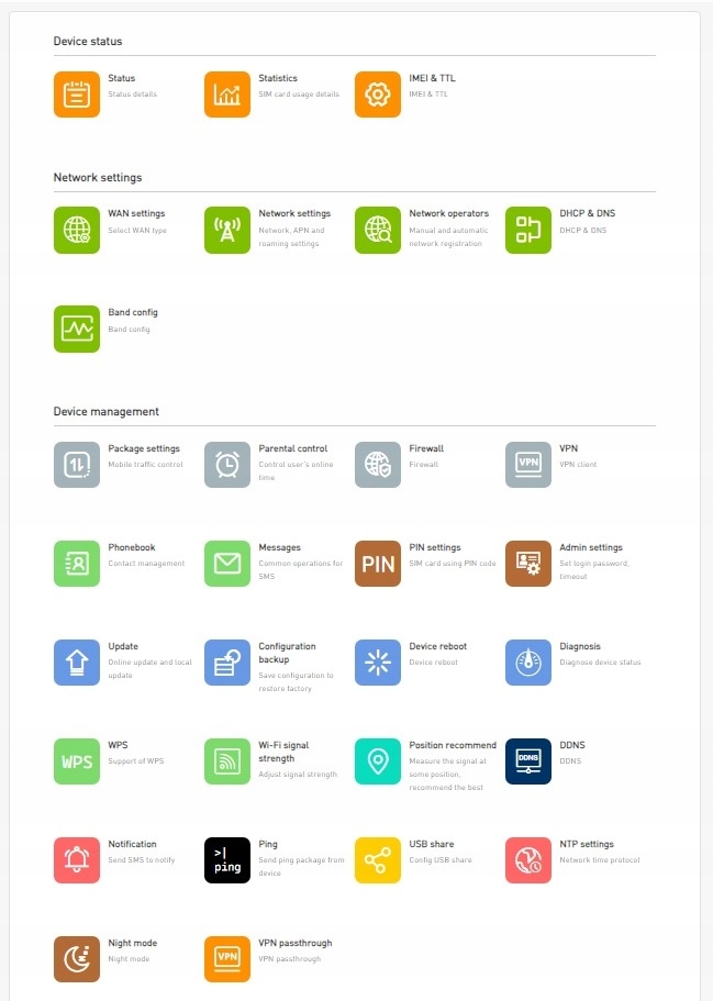 Router wyposażony jest w porty LAN , port USB C, Wi-Fi z obsługą Wi-Fi 6 w techonologii 2.4 Ghz oraz 5 Ghz (obsługa do 32 użytkowników w jednej sieci WiFi, max. 64 użytkowników). Maksymalna przepustowość sieci to 1900Mbps.