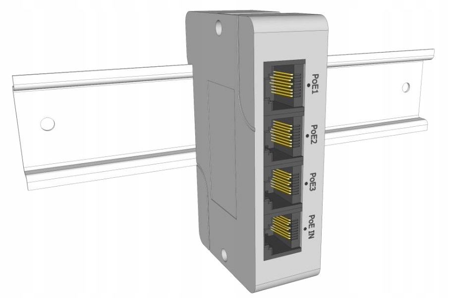 Extender EXT-POE3DIN to urządzenie przeznaczone do zwiększenia odległości przesyłu zasilania PoE oraz danych Ethernet za pomocą skrętki UTP kat. 5/5e o kolejne 100m. Extender jest zasilany ze switcha PoE lub innego urządzenia zgodnego ze standardem PoE (wejście PoE IN). Napięcie wyjściowe oraz dane dostępne są na wyjściach PoE OUT 1 – 3, do których należy podłączyć kamery lub inne urządzenia IP wykorzystujące zasilanie PoE. Maksymalny prąd obciążenia wynosi 0,3A (0,3A/port). Do przesyłu zasilania na portach PoE OUT1, PoE OUT2 wykorzystane są pary 1/2 (-) 3/6(+).