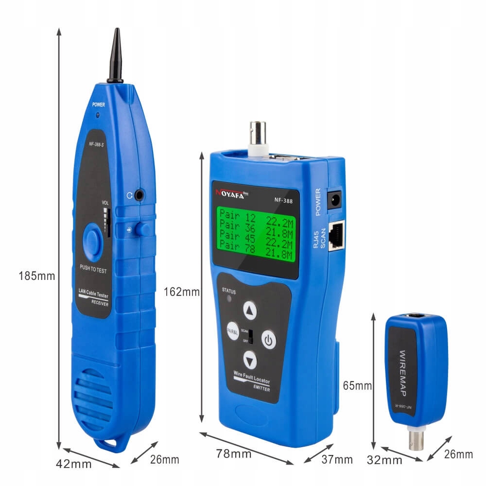 Zaawansowany tester okablowania czytelnym z wyświetlaczem LED. Pozwala na zlokalizowanie miejsca uszkodzenia, długości przewodu, zwarć, zmierzenie odcinka do miejsca uszkodzenia, kompensacji temperatury.