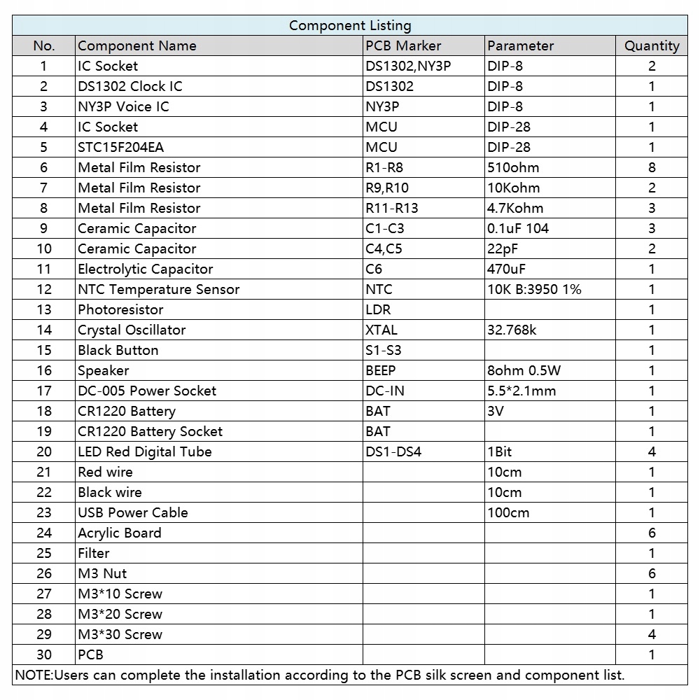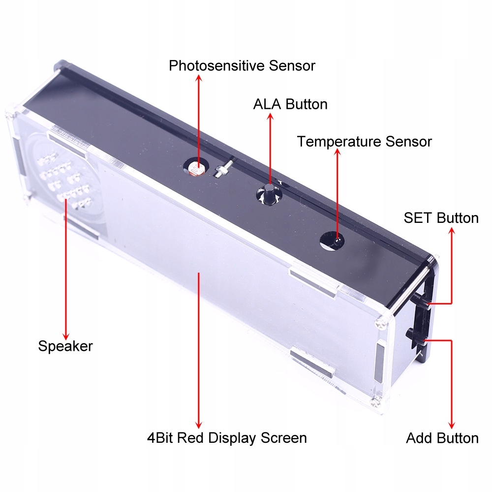 Zestaw umożliwiający montaż modułu zegarka z budzikiem i termometrem oraz zapewnia niezwykłe możliwości edukacyjne w dziedzinie lutowania. Wyposażony w 4-bitowy wyświetlacz cyfrowy RGB LED, umożliwia wyświetlanie aktualnej daty, godziny oraz temperatury. Zestaw daje użytkownikowi kontrolę nad ustawieniem budzika oraz wyborem formatu czasu (12h/24h), zapewniając jednocześnie automatyczną zmianę kolorów i regulację jasności dzięki wykorzystaniu fotorezystora. Dodatkowo, moduł posiada wbudowany buzzer alarmowy oraz przyciski sterujące do łatwej regulacji ustawień. Zasilanie 5V/500mA może być podłączone za pomocą złącza DC JACK. Zestaw ten nie tylko pozwala na naukę lutowania, ale również oferuje praktyczne zastosowania, sprawiając, że jest idealny zarówno dla początkujących, jak i zaawansowanych entuzjastów elektroniki. Dźwięk alarmu jest generowany przez niewielki głośnik.