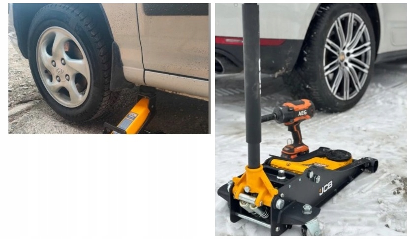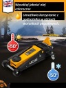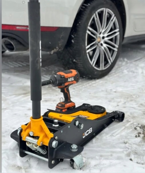 Praktyczny podnośnik samochodowy, wyposażony w koła jezdne, dzięki czemu łatwo się go przemieszcza.