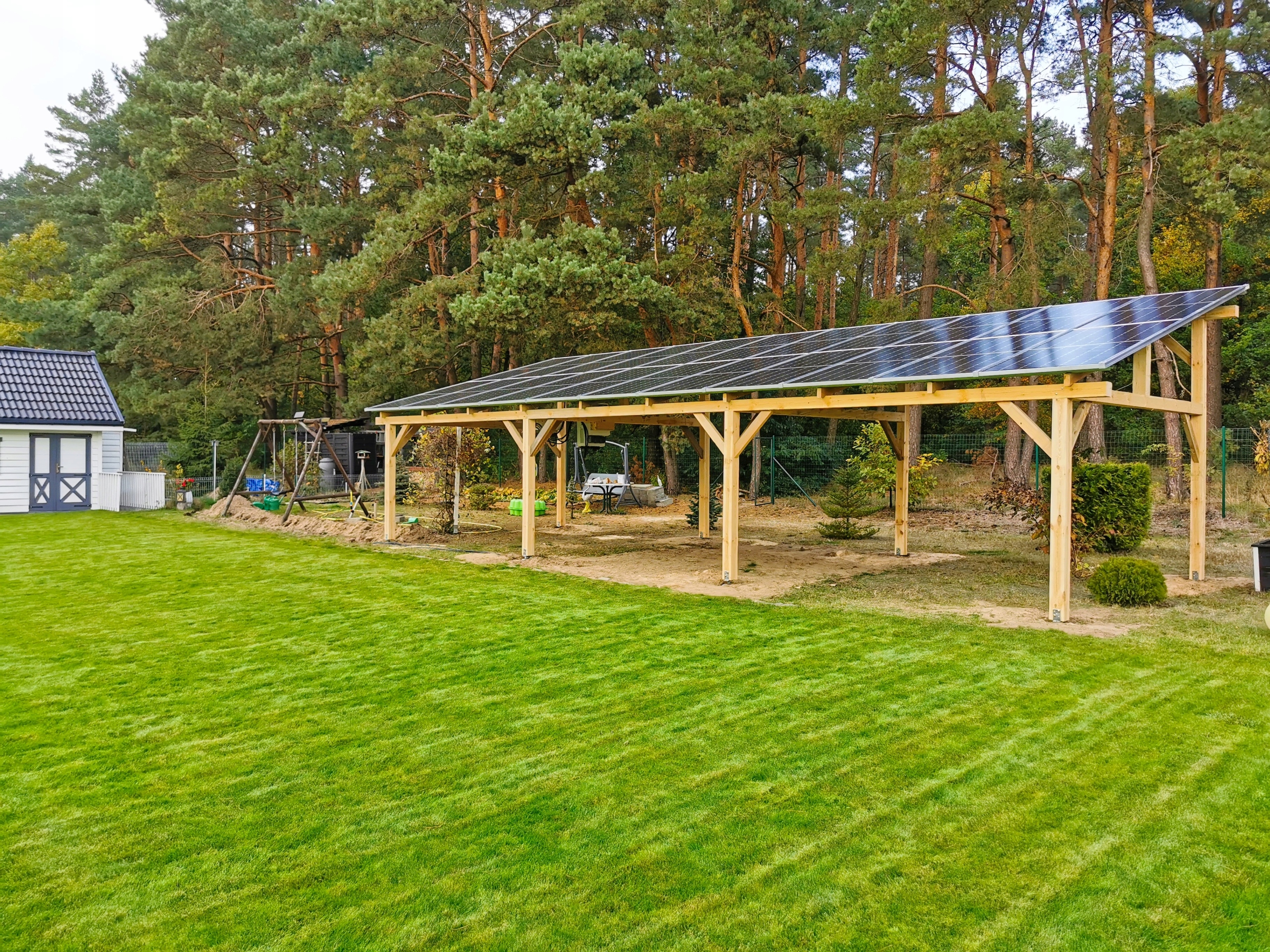 Innowacyjna konstrukcja z drewna KVH C24: Nasza wiata opiera się na 9 wkopanych kotwach betonowych. Konstrukcja wykonana jest z trwałego drewna KVH C24, jednego z najlepszych materiałów budowlanych. KVH to czterostronnie strugane drewno konstrukcyjne, suszone do wilgotności 15%, co zapewnia jego wytrzymałość i niezawodność. Nasze konstrukcje są bardziej odporne na warunki atmosferyczne niż wiaty z cienkiej stali profilowanej.