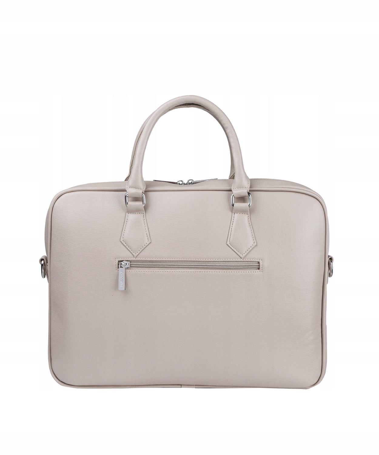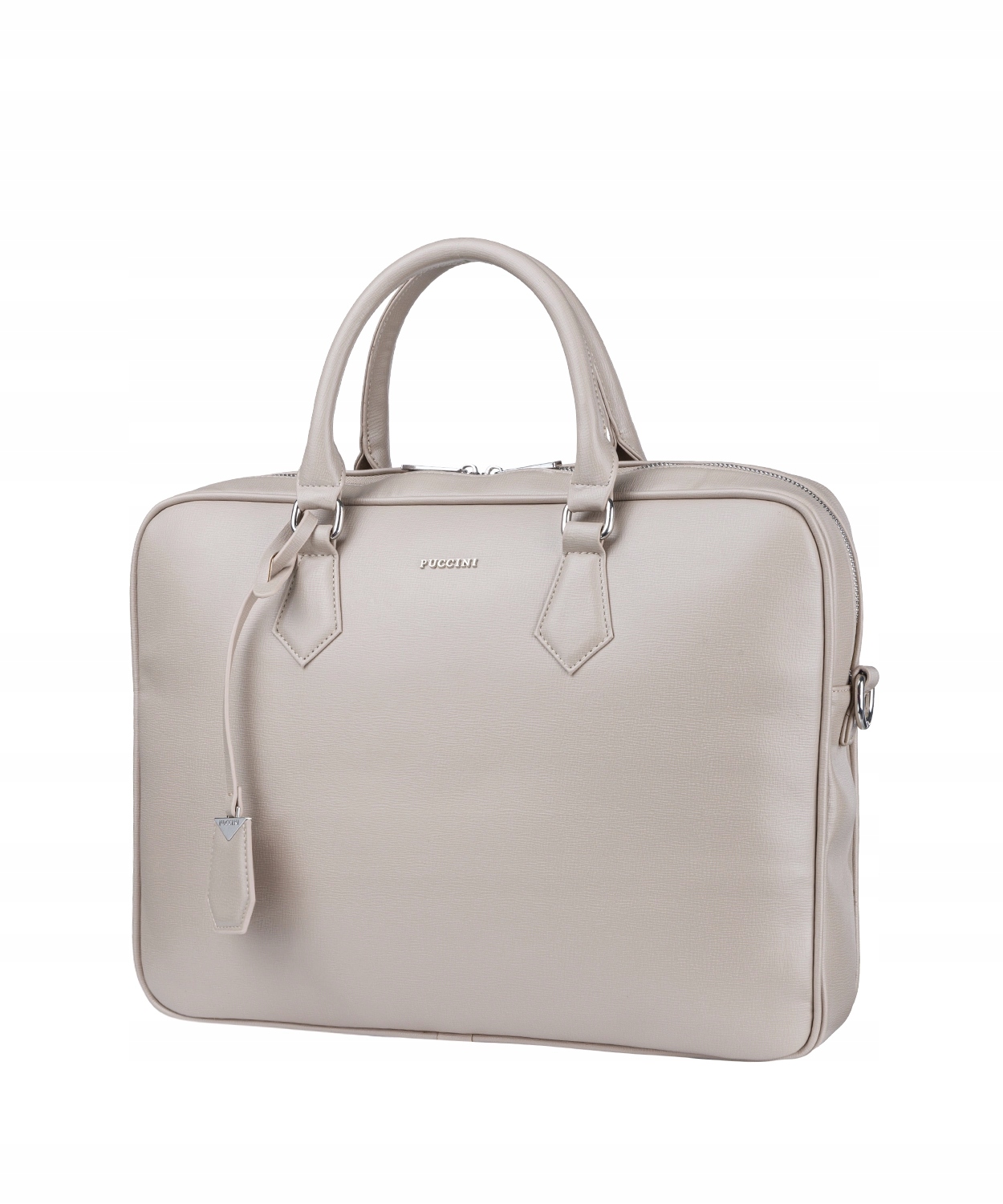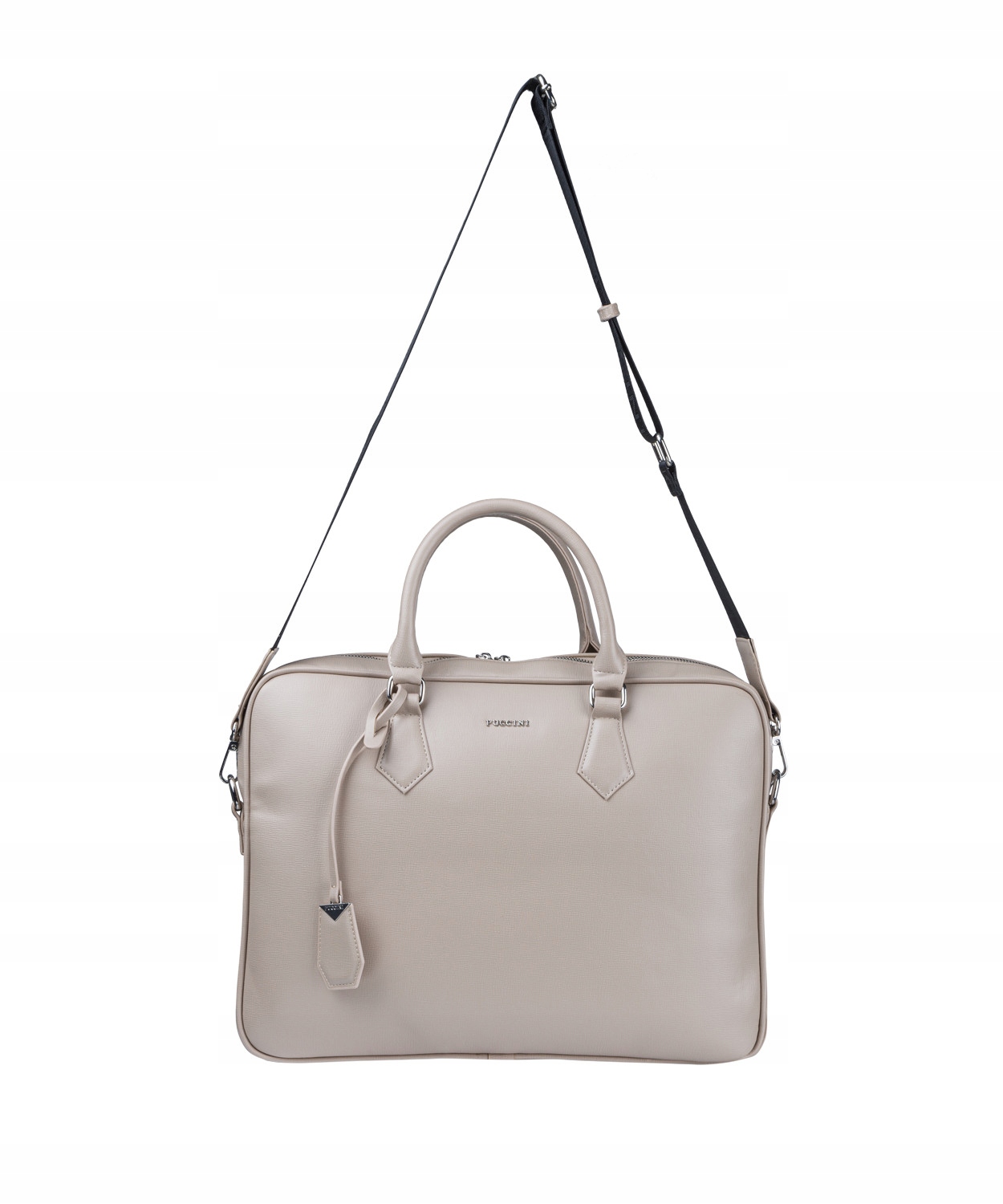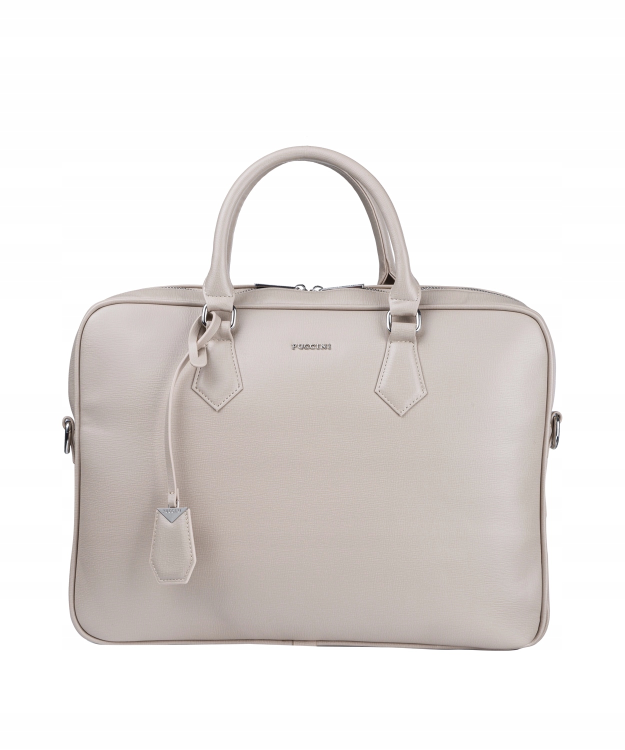 Charakterystycznym akcentem na pasku jest wytłoczona nazwa marki. Przód torebki zdobi dyskretna nazwa Puccini, a na uchwycie został zaczepiony gustowny brelok ze skóry ekologicznej. Z tyłu znajduje się funkcjonalna kieszeń zapinana suwakiem. Wszelkie elementy metalowe są w kolorze srebrnym, natomiast wnętrze torebki wyścielane jest logowanym poliestrem. Model wyposażony jest w nóżki, które zabezpieczają jego spód.