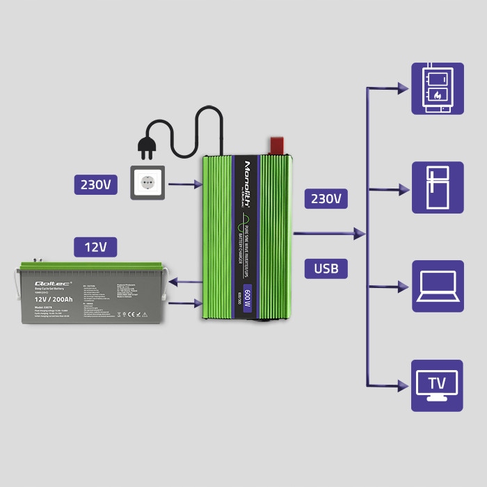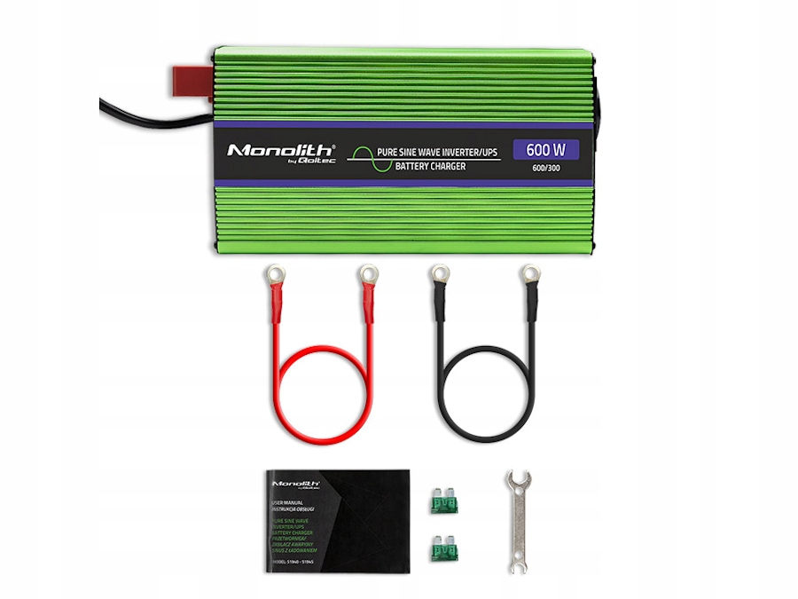 Przetwornica napięcia z ładowaniem baterii Monolith 300W / 600W 12V na 230V Czysty Sinus Qoltec 51940 (Kod PLU: __6941__)