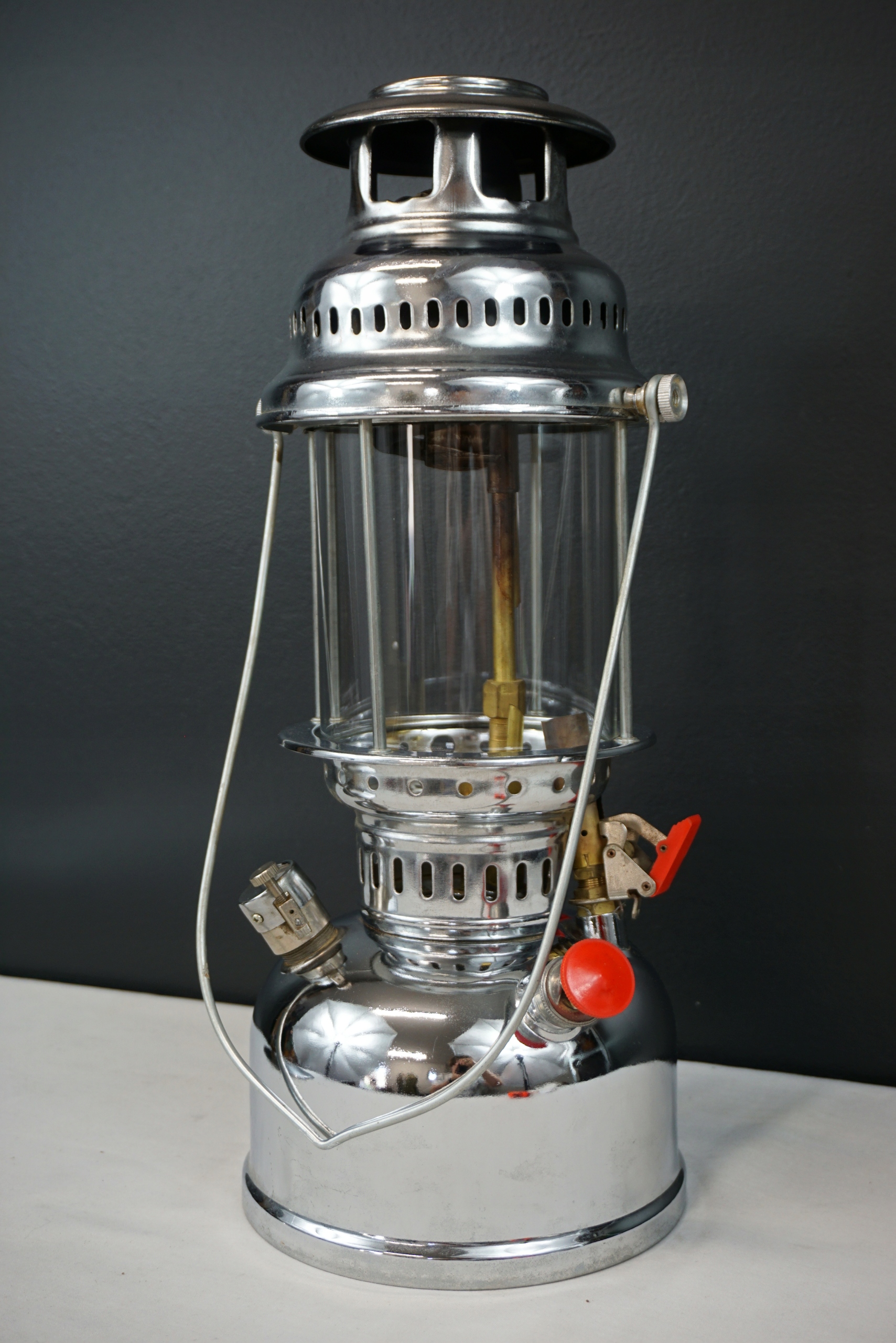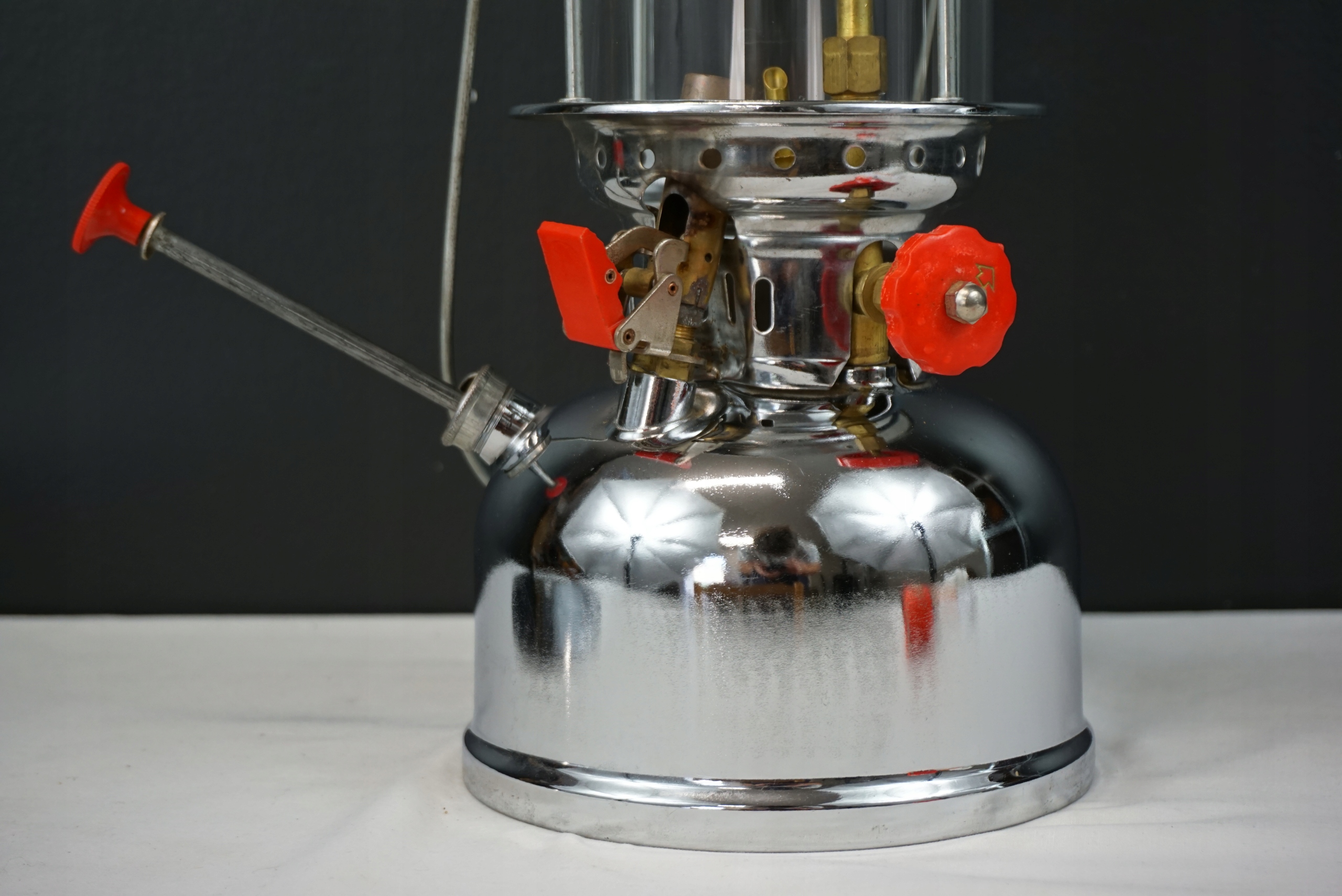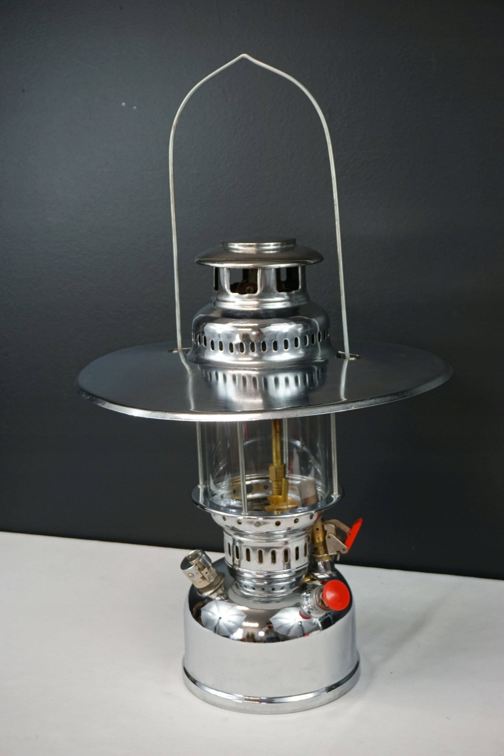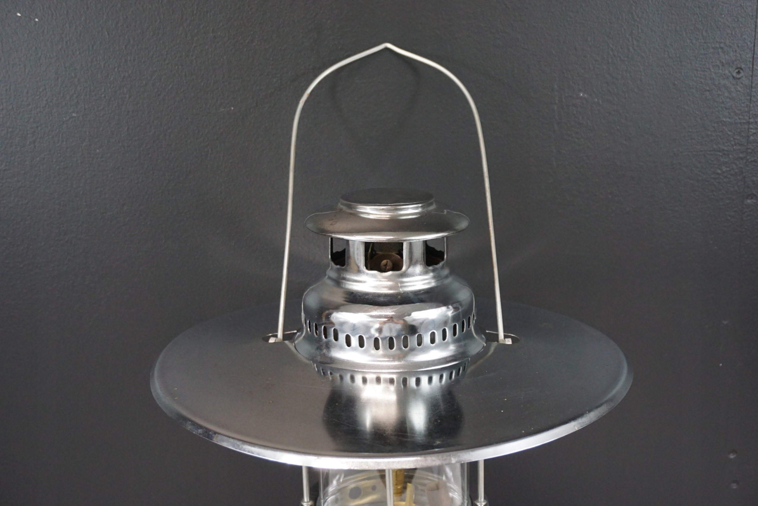 Lampa ciśnieniowa znaleziona na strychu. Delikatnie oczyszczona. Szkło bez uszkodzeń. Zdejmowany daszek z widocznymi śladami użytkowania. Stan techniczny nieznany, dlatego sprzedaję jako niesprawną - do przeglądu/naprawy. Wysokość 41cm, średnica daszka 33.5cm, średnica podstawy 16.5cm.