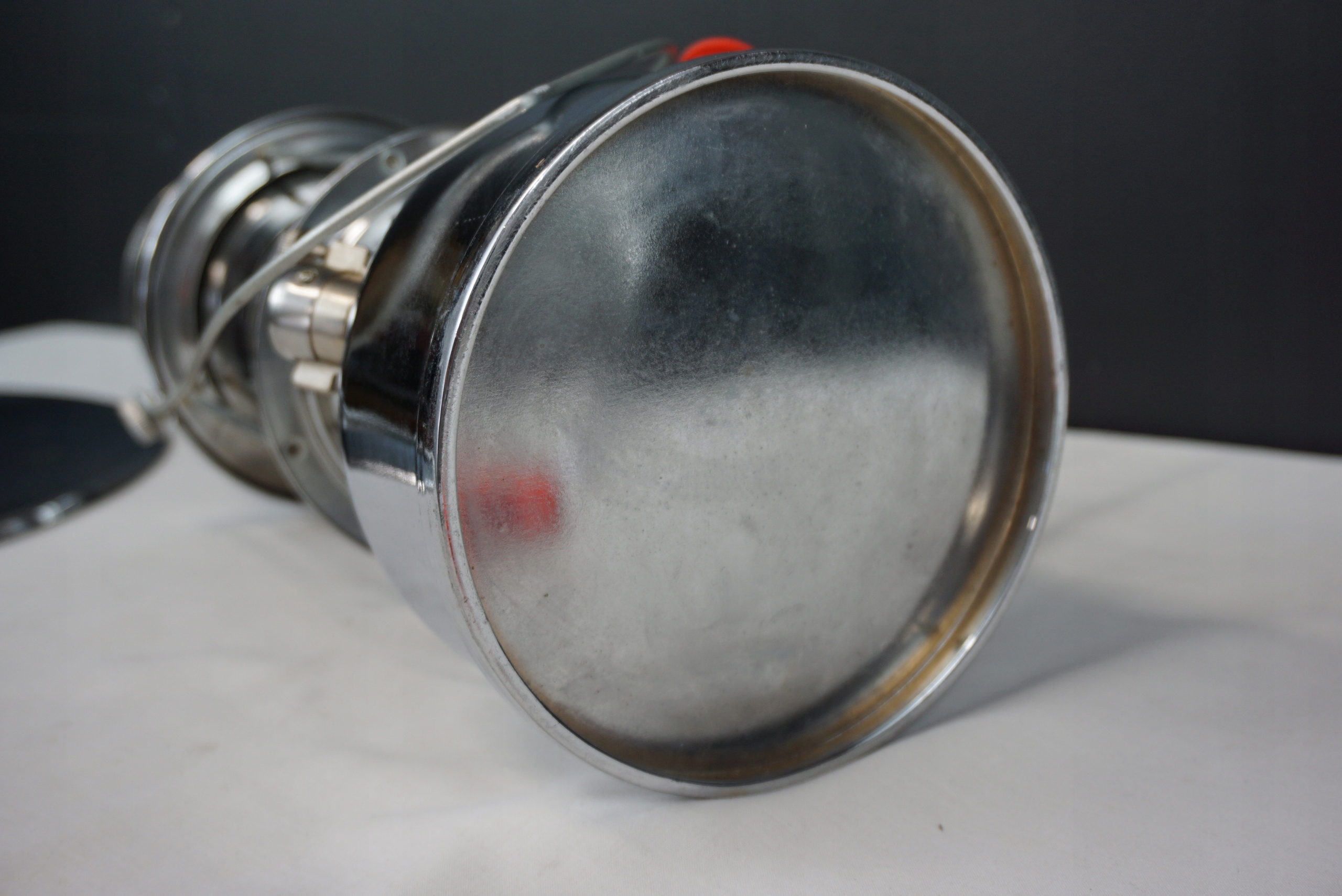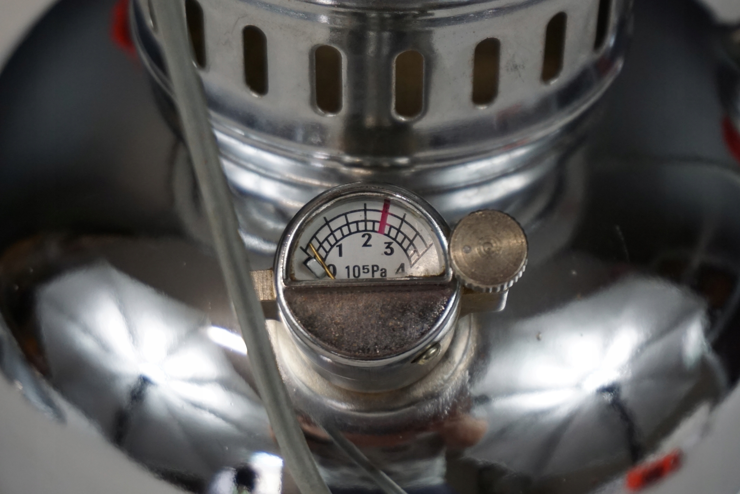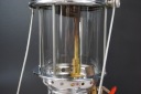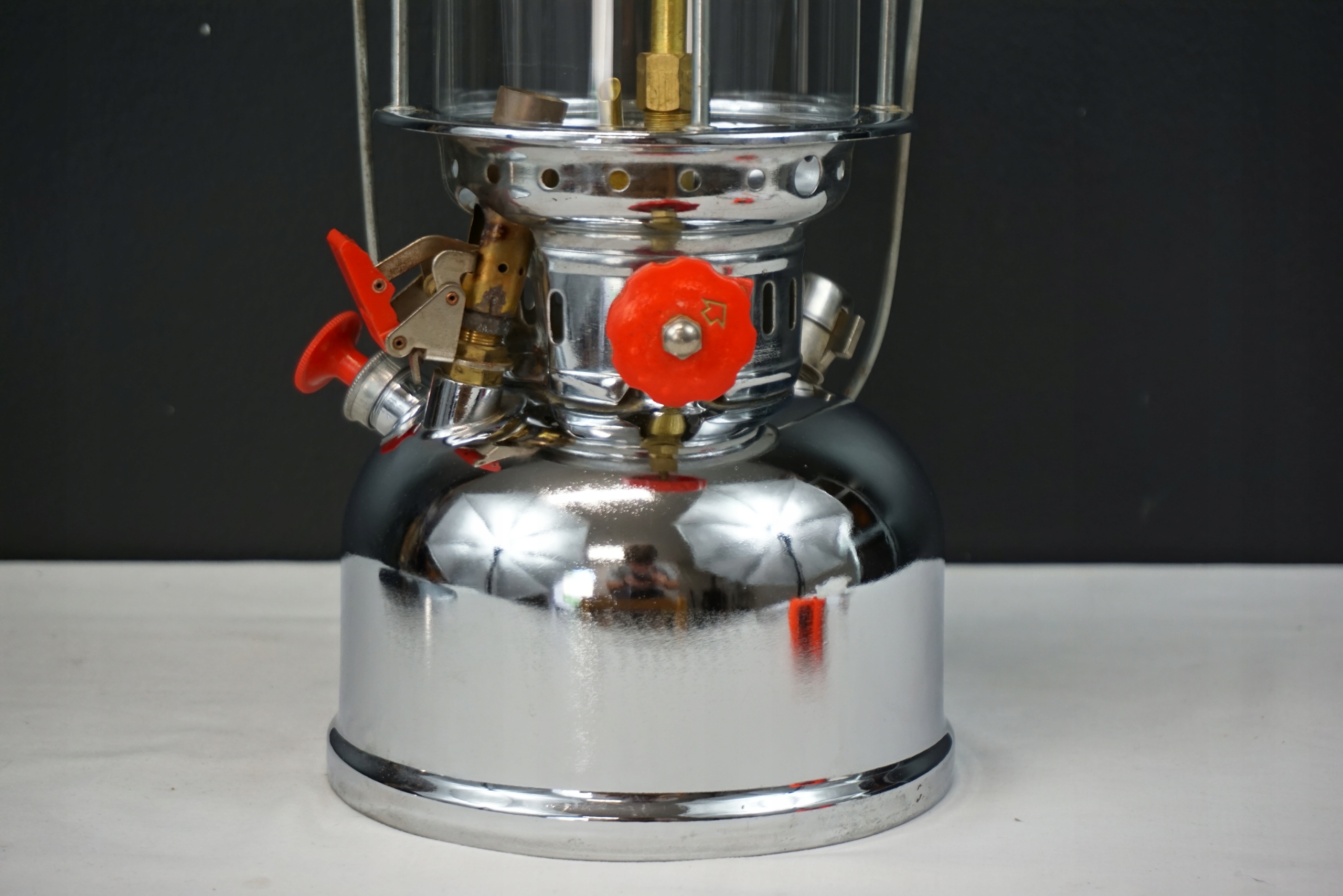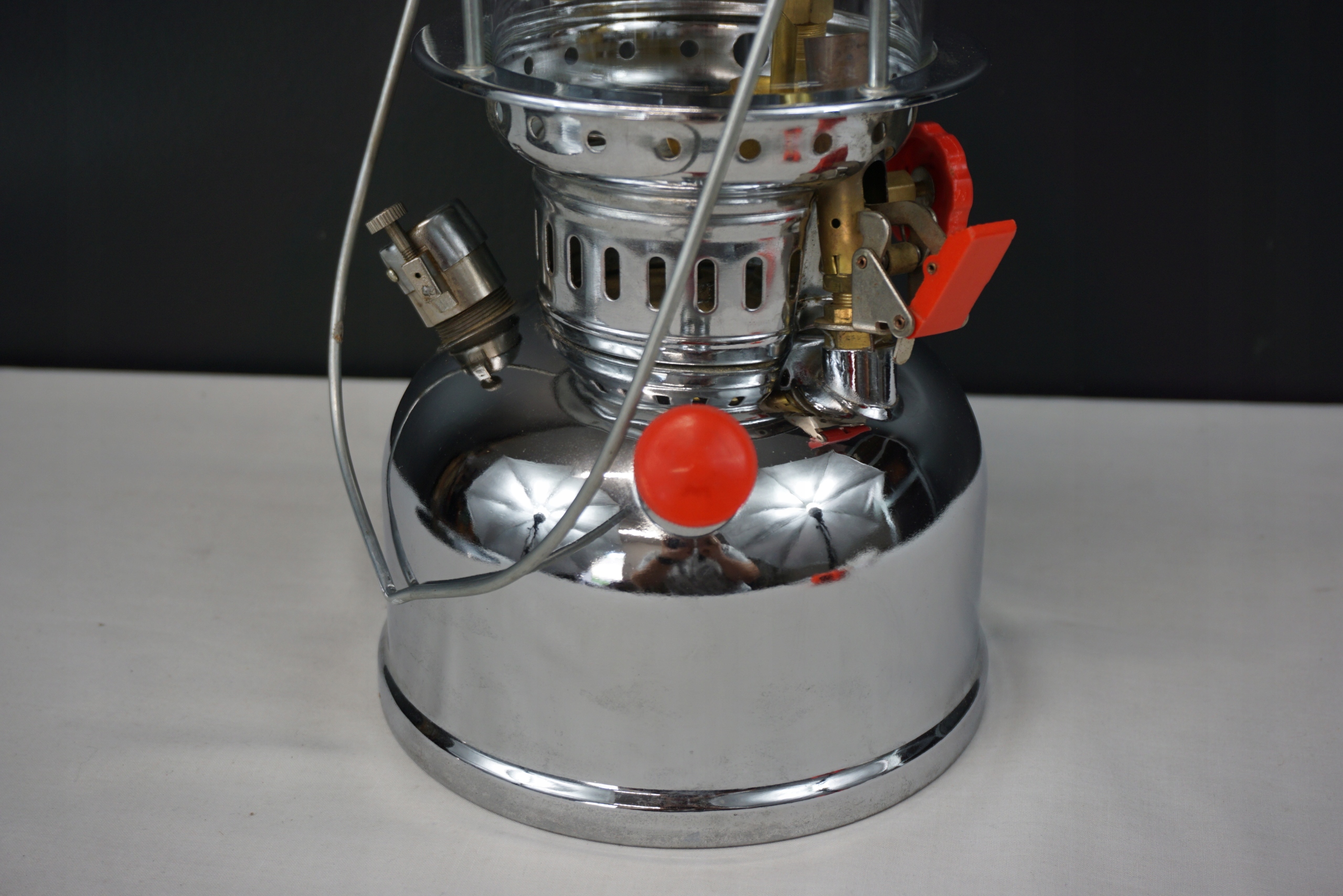Lampa ciśnieniowa znaleziona na strychu. Delikatnie oczyszczona. Szkło bez uszkodzeń. Zdejmowany daszek z widocznymi śladami użytkowania. Stan techniczny nieznany, dlatego sprzedaję jako niesprawną - do przeglądu/naprawy. Wysokość 41cm, średnica daszka 33.5cm, średnica podstawy 16.5cm.