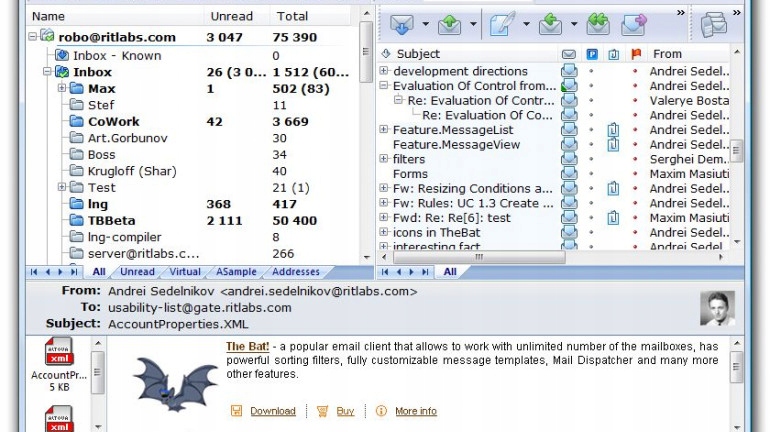 Wyszukiwanie i sortowanie w programie The Bat! dzięki zaawansowanemu silnikowi. Program The Bat! bardzo dobrze obsługuje załączone pliki, a jego narzędzie importu pozwala łatwo radzić sobie z plikami, wyeksportowanymi od innych klientów pocztowych.