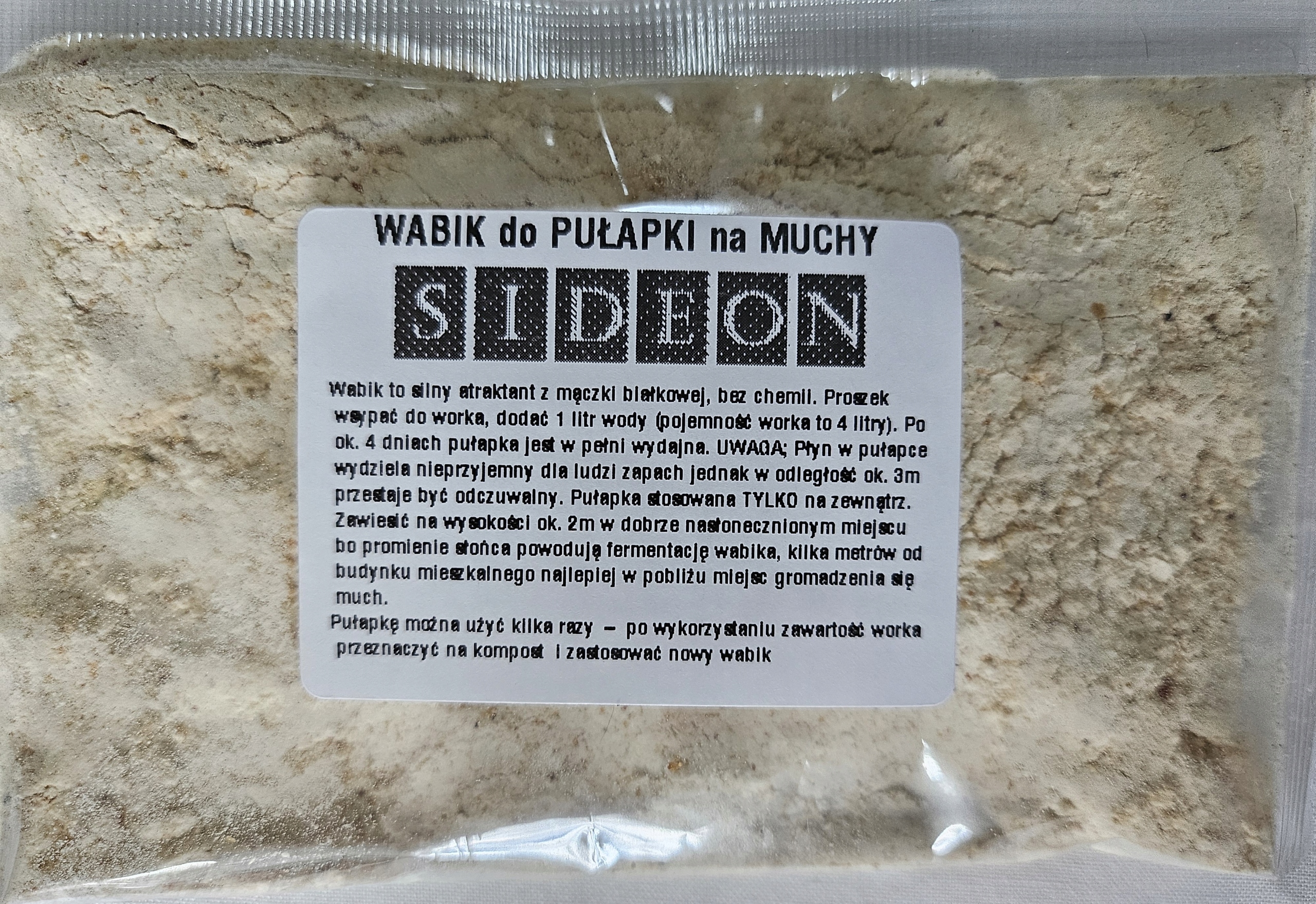 Wabik z torebki należy wsypać do worka pułapki i dodać 0,5 litra ciepłej wody (pojemność worka to 4 litry). Po ok. 4 dniach jest w pełni wydajna. Skuteczność wabika do 6 tygodni i do 80000 złapanych much. W miarę potrzeb należy uzupełniać ubytki wody. Na innych naszych aukcjach można dokupić zapasowy wabik, przydatny po wyczerpaniu możliwości tego z zestawu. I wykorzystać pułapkę jeszcze raz.