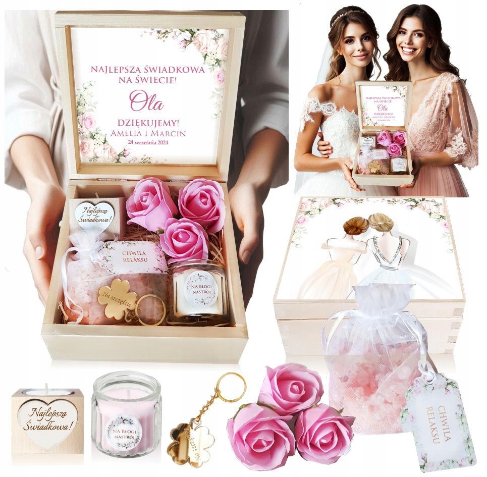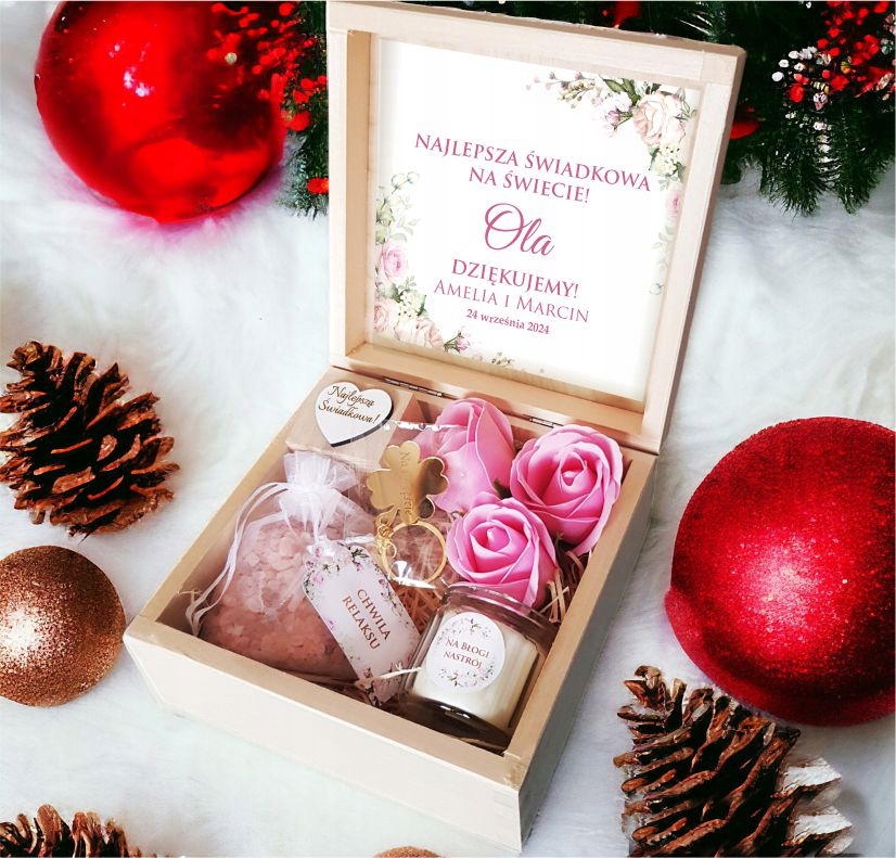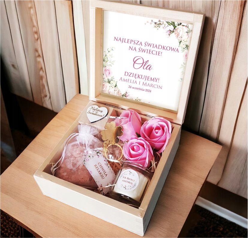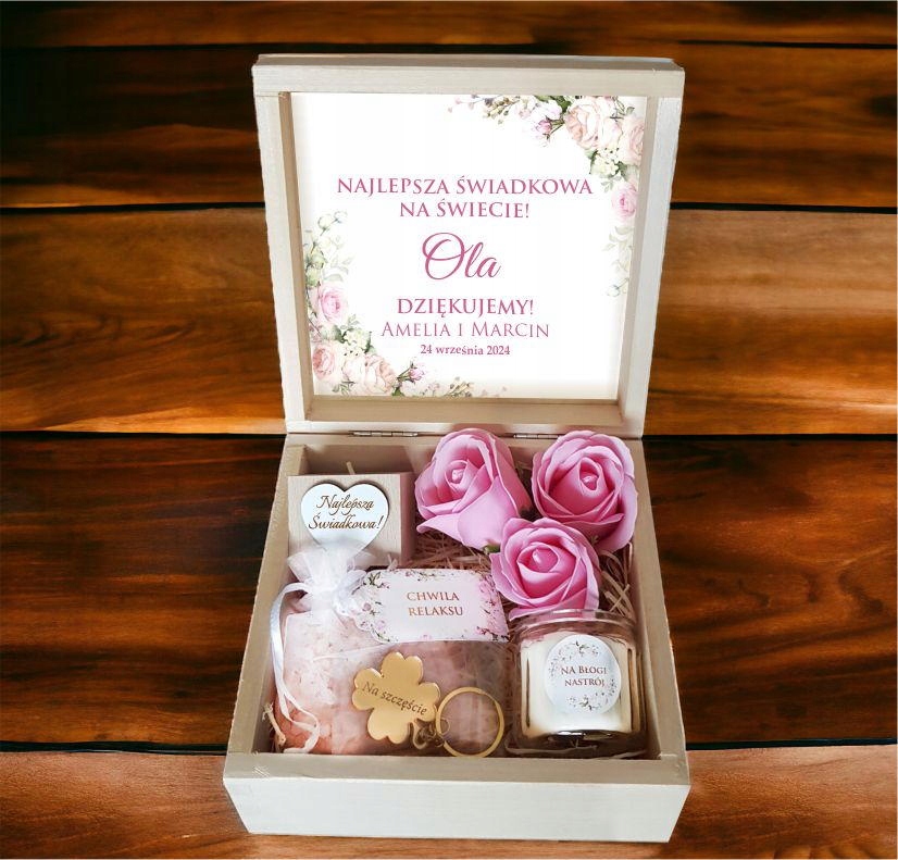 Znajdują się w niej między innymi sole do kąpieli oraz kwiaty mydlane, dzięki którym można urządzić domowe SPA. Poza produktami do relaksacyjnych kąpieli w pudełku prezentowym znajduje się także zapachowa świeczka w szkle, drewniany świecznik z napisem "Najlepsza Świadkowa" . Błyszczącym dodatkiem będzie złota, grawerowana koniczyna w formie breloka do kluczy.