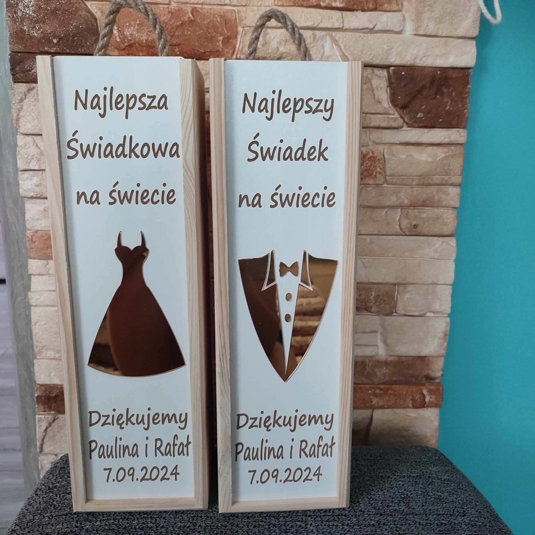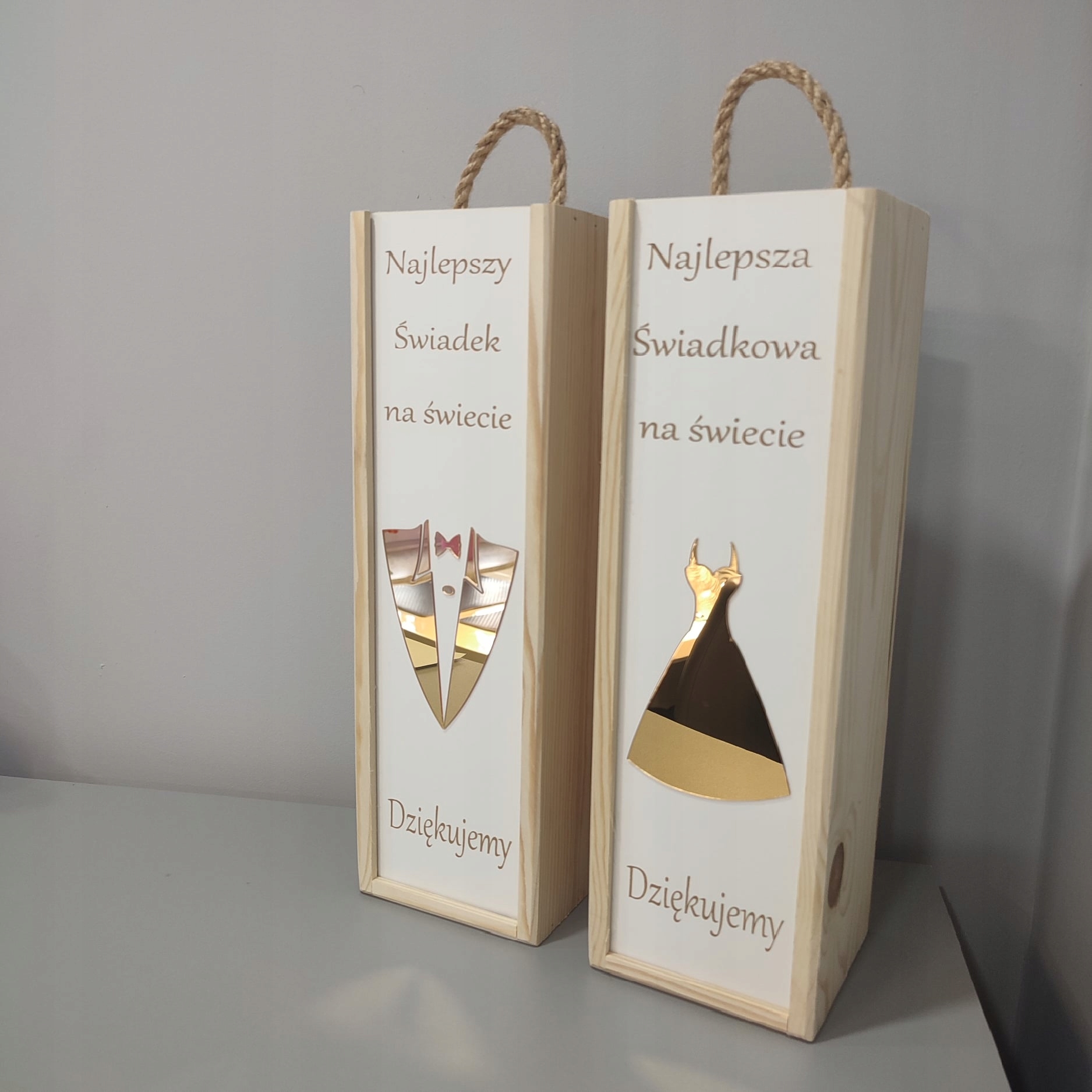 Komplet 2 skrzynek na wino jako prezent dla świadków ozdobione lustrzana plexi w kolorze złotym