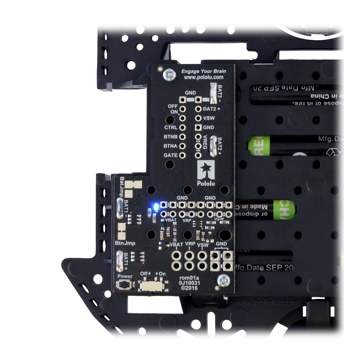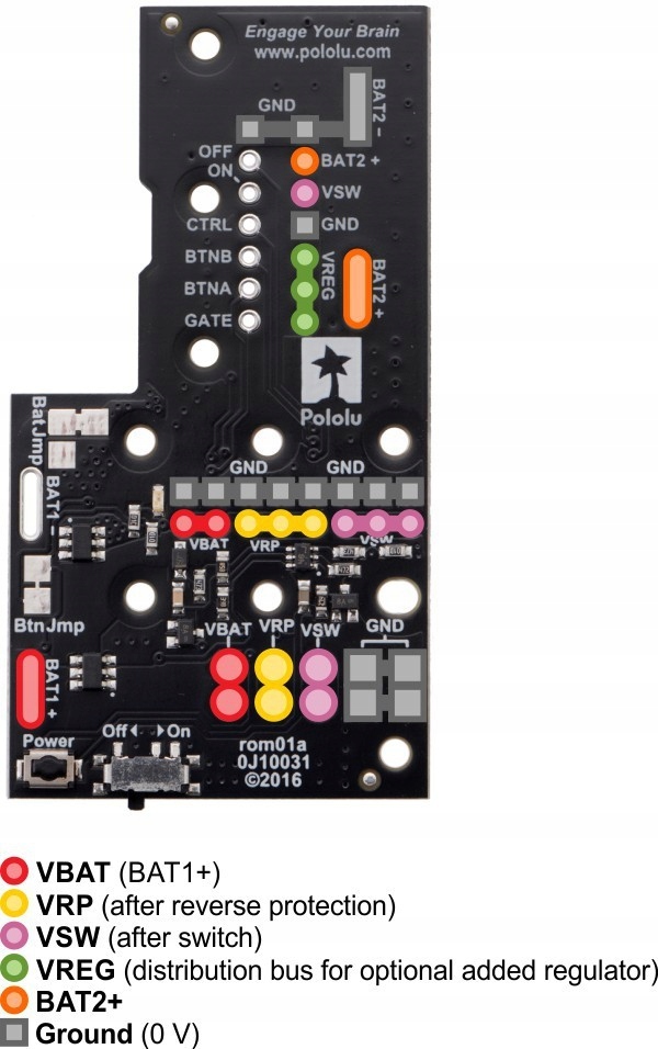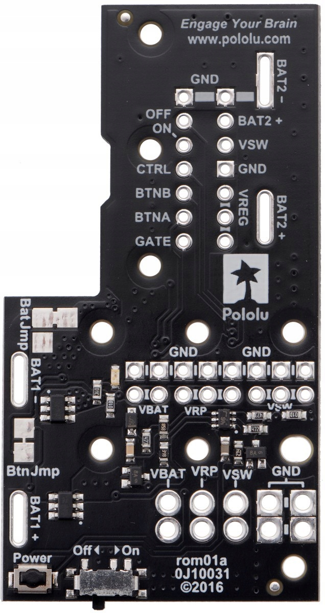 Moduł zasilania został zaprojektowany specjalnie dla podwozia Romi chassis. Z jego pomocą zyskujemy łatwy dostęp do wyprowadzeń baterii co pozwala rozdzielić zasilanie na inne moduły znajdujące się na podwoziu (mikrokontrolery, czujniki). Moduł ma zabezpieczenie przed odwrotnym podłączeniem baterii. Wbudowany specjalny układ pozwala na wybór jednego z trybów zasilania. Posiada przełącznik suwakowy, który pełni role włącznika.
