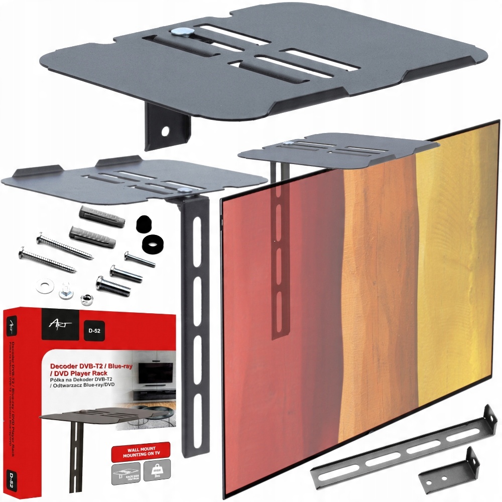 Dzięki dwóm dołączonym elementom montażowym każdy dopasuje montaż półki do swoich preferencji. Półka ma udźwig 3 kg, więc spokojnie można na niej ustawić odtwarzacz DVD lub dekoder. Będzie również świetnym organizerem na piloty.