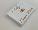 Na tej aukcji kupisz białe pudełko na obrączki. Na wieczku jest napis "I ślubuję Ci" wykonany z srebrnego lustra, zaś imiona nowożeńców wykonane są ze złotej, lustrzanej plexi. Grawerowane obrączki to również złota, lustrzana plexa 3mm.