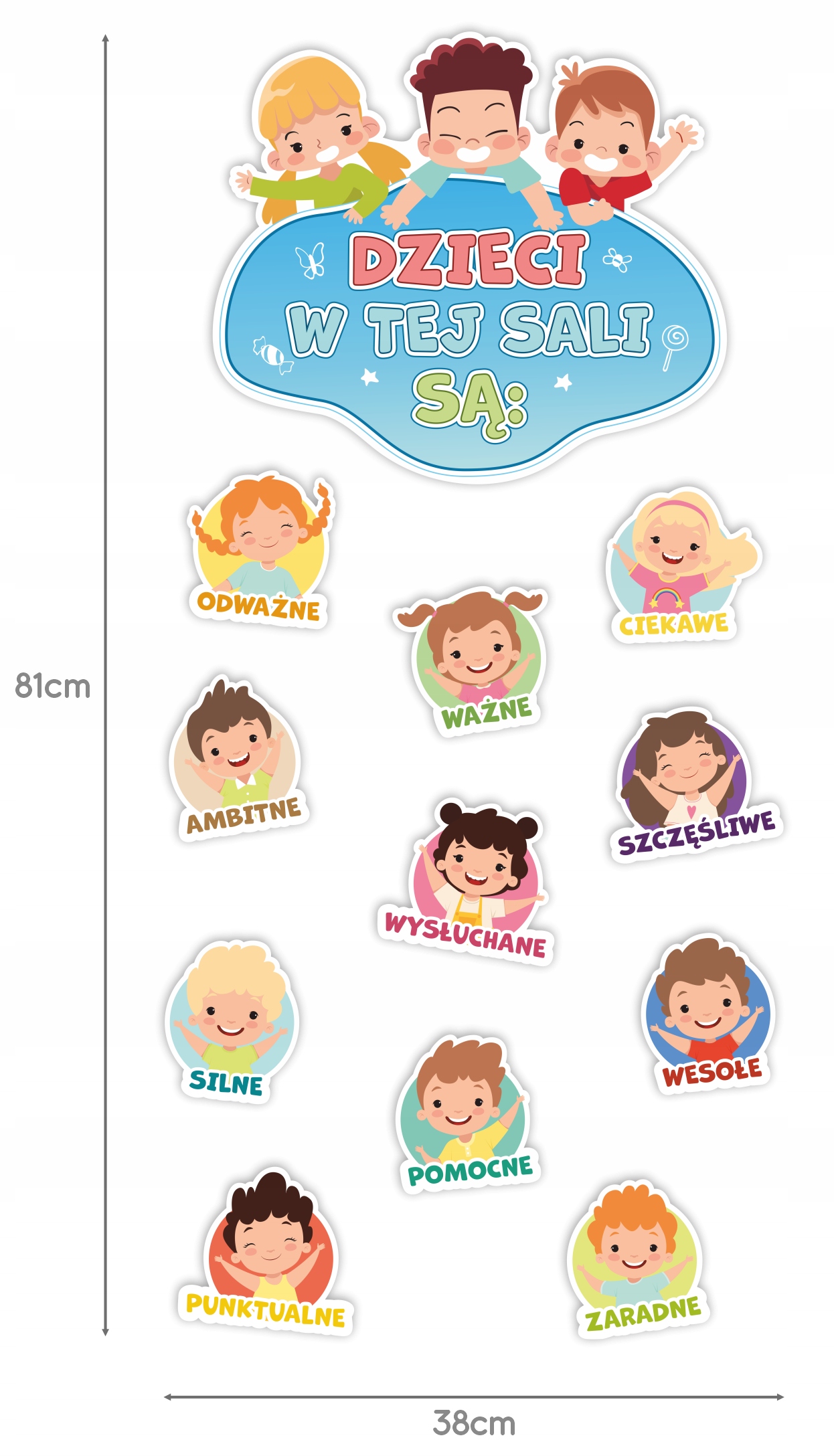 Zestaw zawiera aż 12 elementów - 1 duża wycięta tabliczka z napisem "dzieci w tej sali są..." i 11 mniejszych elementów z dziećmi oraz cechami.