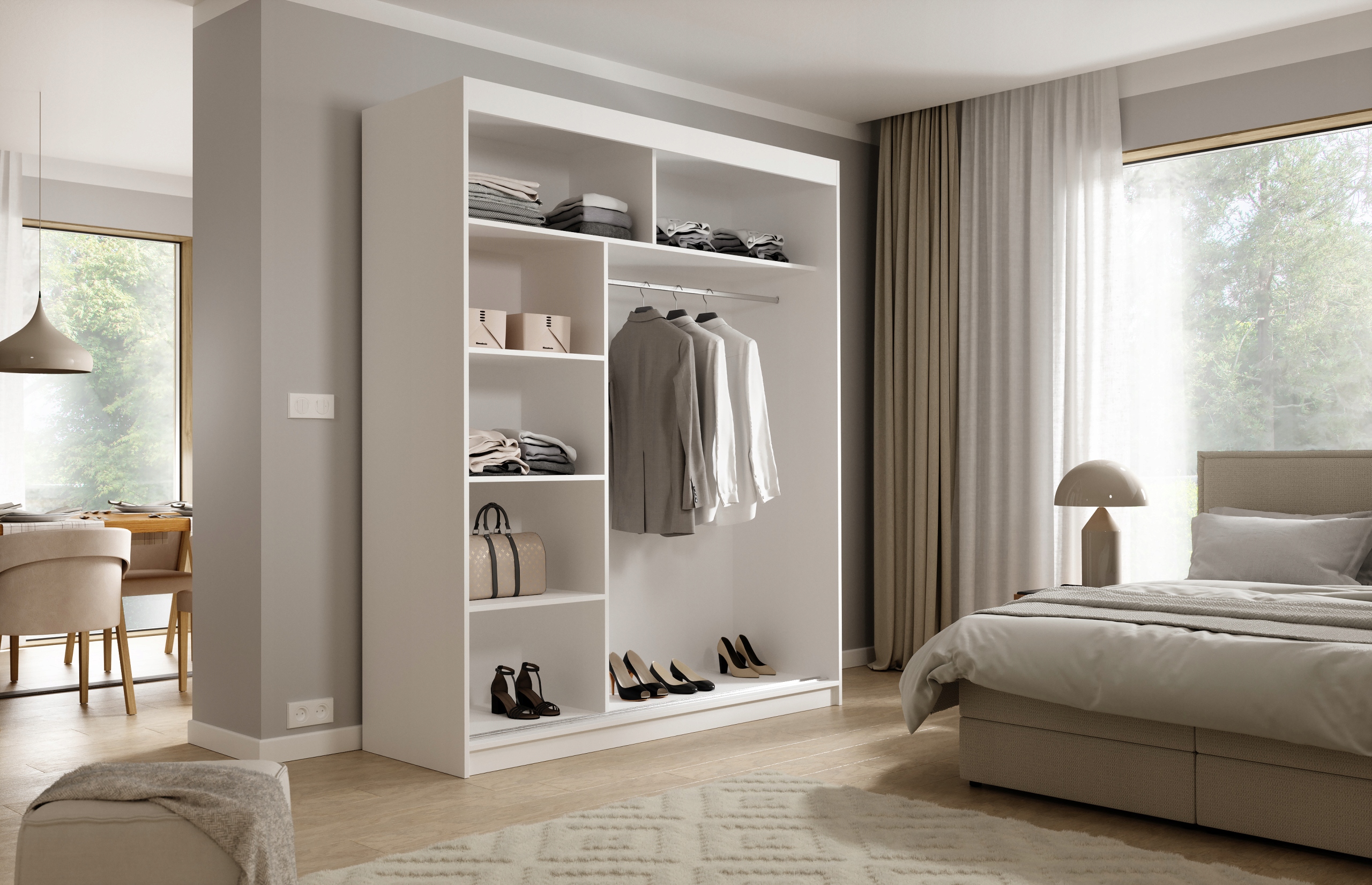 2. Wewnątrz szafy z przesuwanymi drzwiami znajdują się wysokie oraz głębokie półki i drążek na wieszaki, co umożliwia przechowywanie ubrań, butów, bielizny i długich płaszczy. To rozwiązanie pomaga łatwo organizować swoje rzeczy, utrzymywać porządek i przejrzystość w szafie.