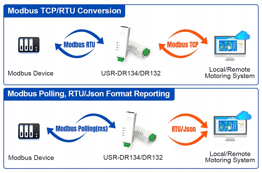 USR-DR132 to nowy ultra-mały serwer urządzeń szeregowych typu szynowego wprowadzony przez PUSR. Realizuje dwukierunkową przezroczystą transmisję danych między RS232 i Ethernet, integruje 1 port szeregowy i 1 port Ethernet z szybkością 10/100 Mb / s.