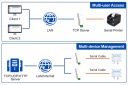 W trybie serwera TCP obsługuje dostęp wielu klientów TCP, co umożliwia kontrolę urządzeń szeregowych przez wielu użytkowników.