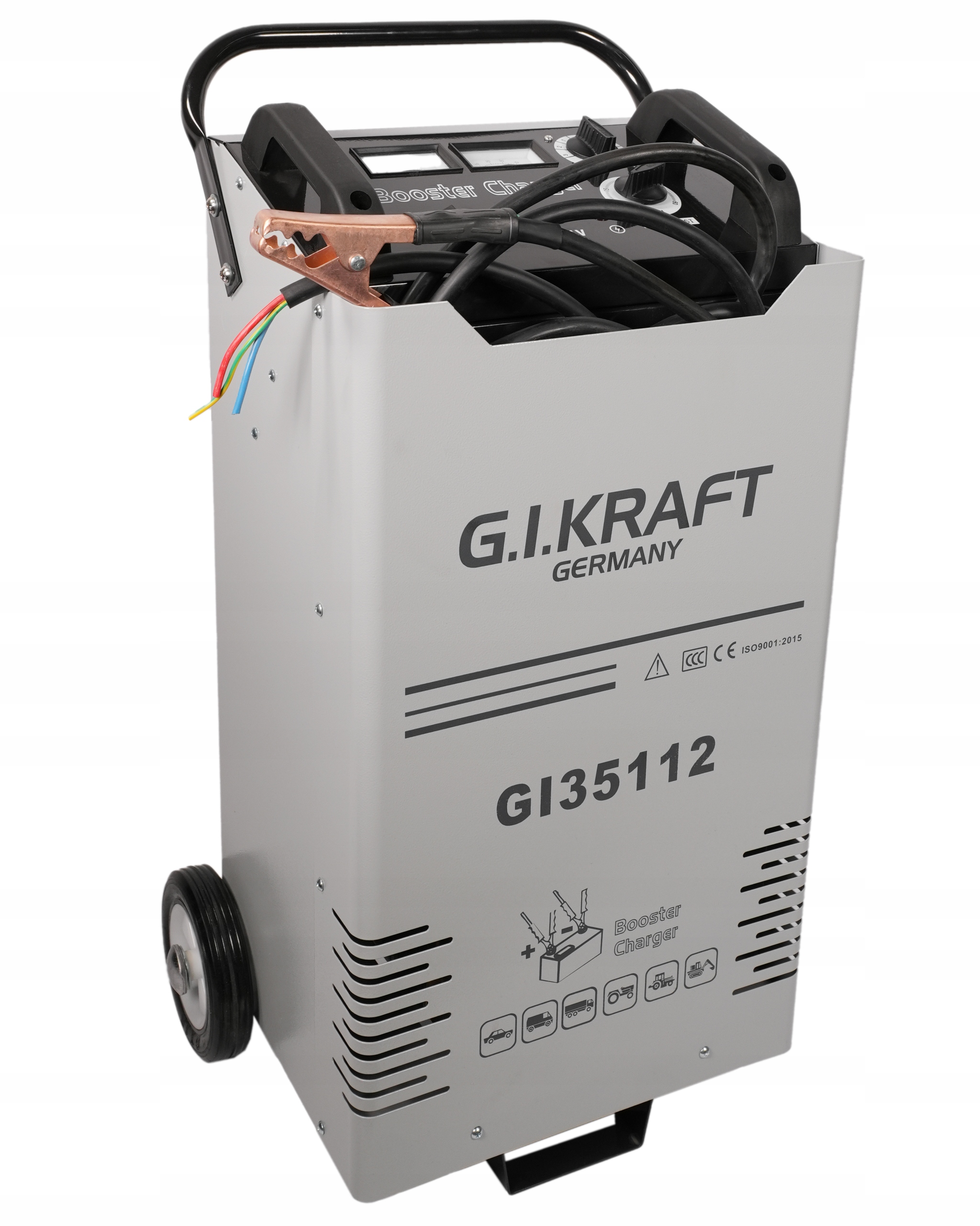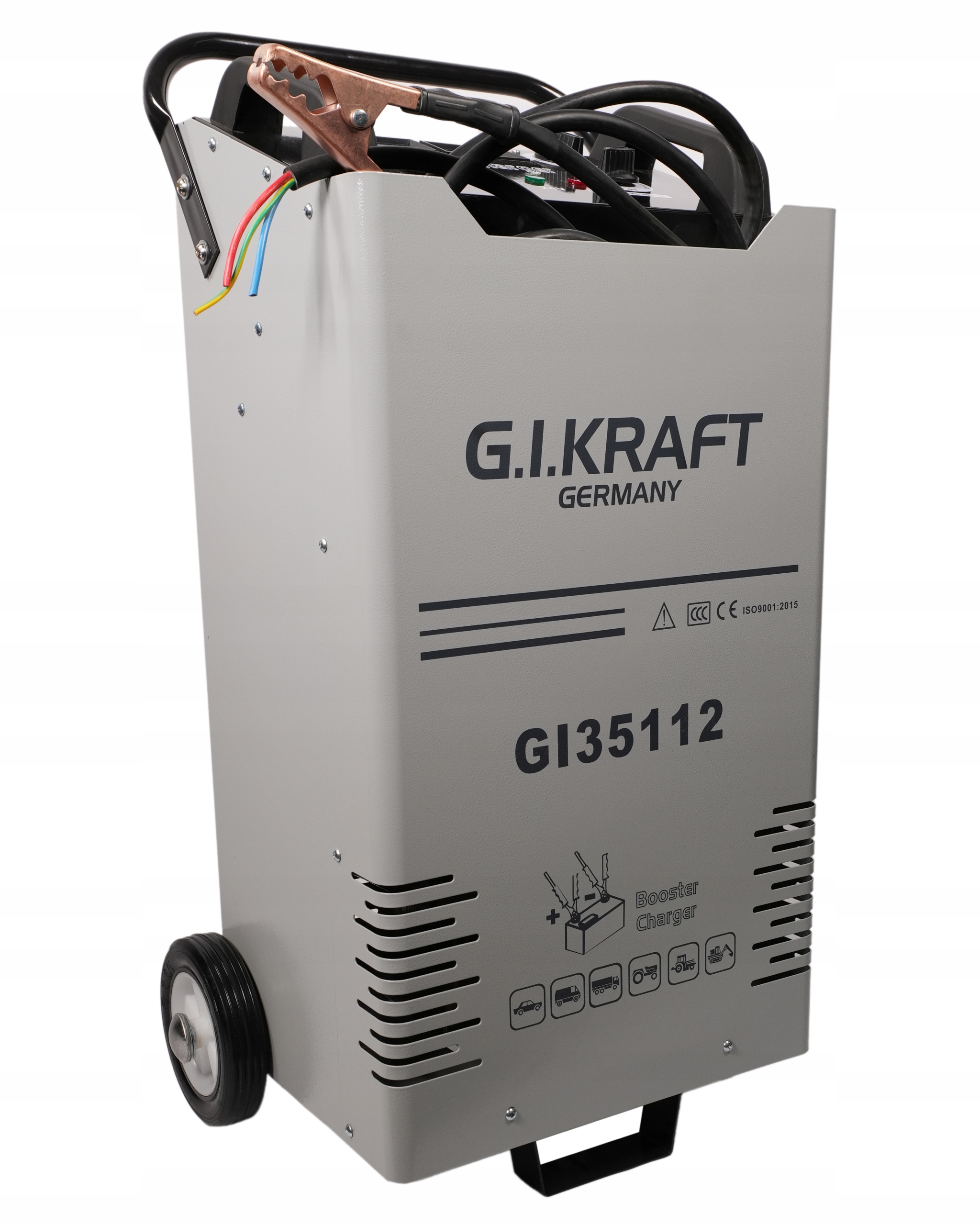 Urządzenie rozruchowo-ładowane G.I.KRAFT GI35112 jest przeznaczone do ładowania akumulatorów o napięciu 12V lub 24V, a także do wspomagania rozruchu silnika pojazdu razem z akumulatorem 12V lub 24V. Pobór mocy urządzenia wynosi 1600W, a napięcie zasilania 220V.