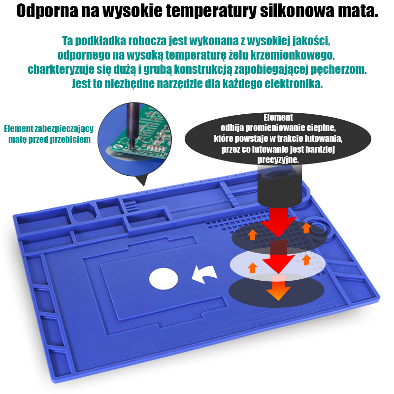 ✅ Duża płaska powierzchnia oraz odporność na wysoką temperaturę pozwala na lutowanie płyt, ekranów położonych bezpośrednio na macie