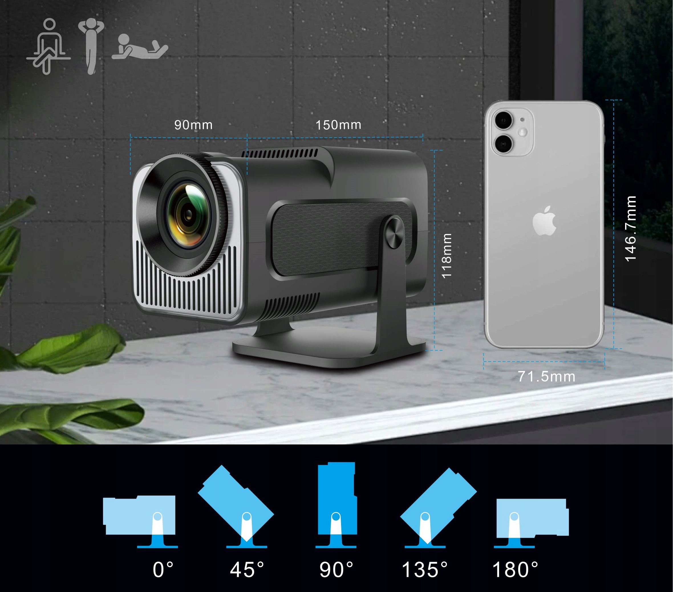 Korzystanie z tego wszechstronnego projektora jest łatwe: 180-stopniowy stojak obrotowy umożliwia umieszczenie obrazu w dowolnym miejscu od podłogi do sufitu, zapewniając elastyczność odtwarzania filmów.