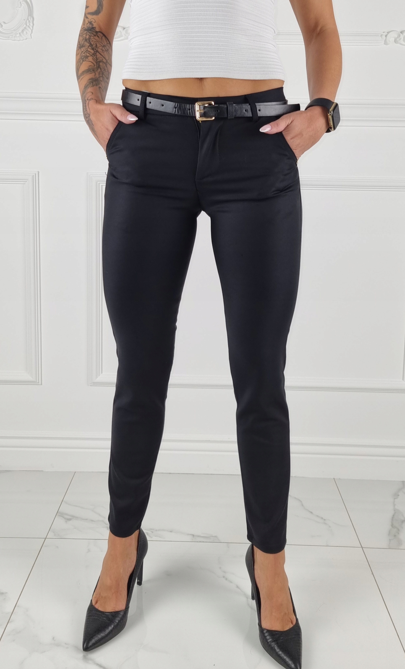 Eleganckie klasyczne spodnie cygaretki , posiadają wysoki stan. Świetne w połączeniu ze szpilkami, dzięki swojej uniwersalności, pasują niemal do każdej stylizacji. Elastyczny materiał podkreśla kobiecą sylwetkę. Spodnie są dopasowane, rozciągają się. Podkreśl swoje kobiece kształty! Spraw, by Twój codzienny Look był niepowtarzalny.