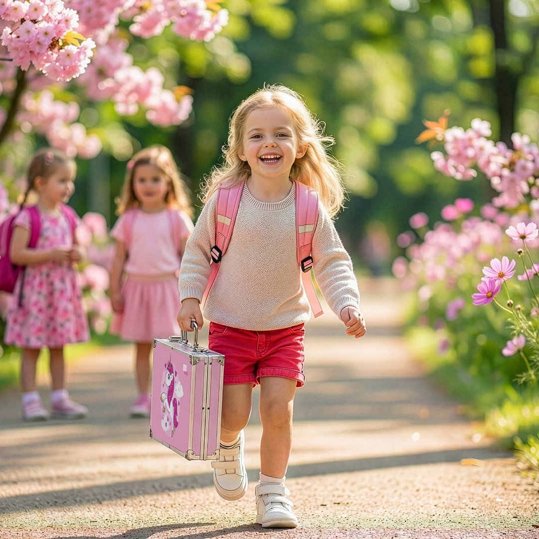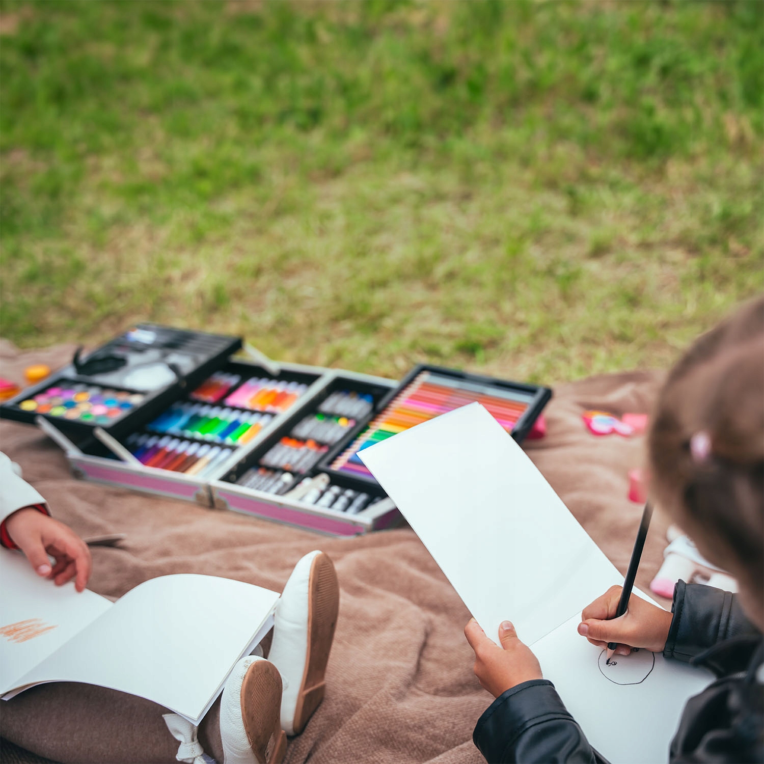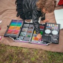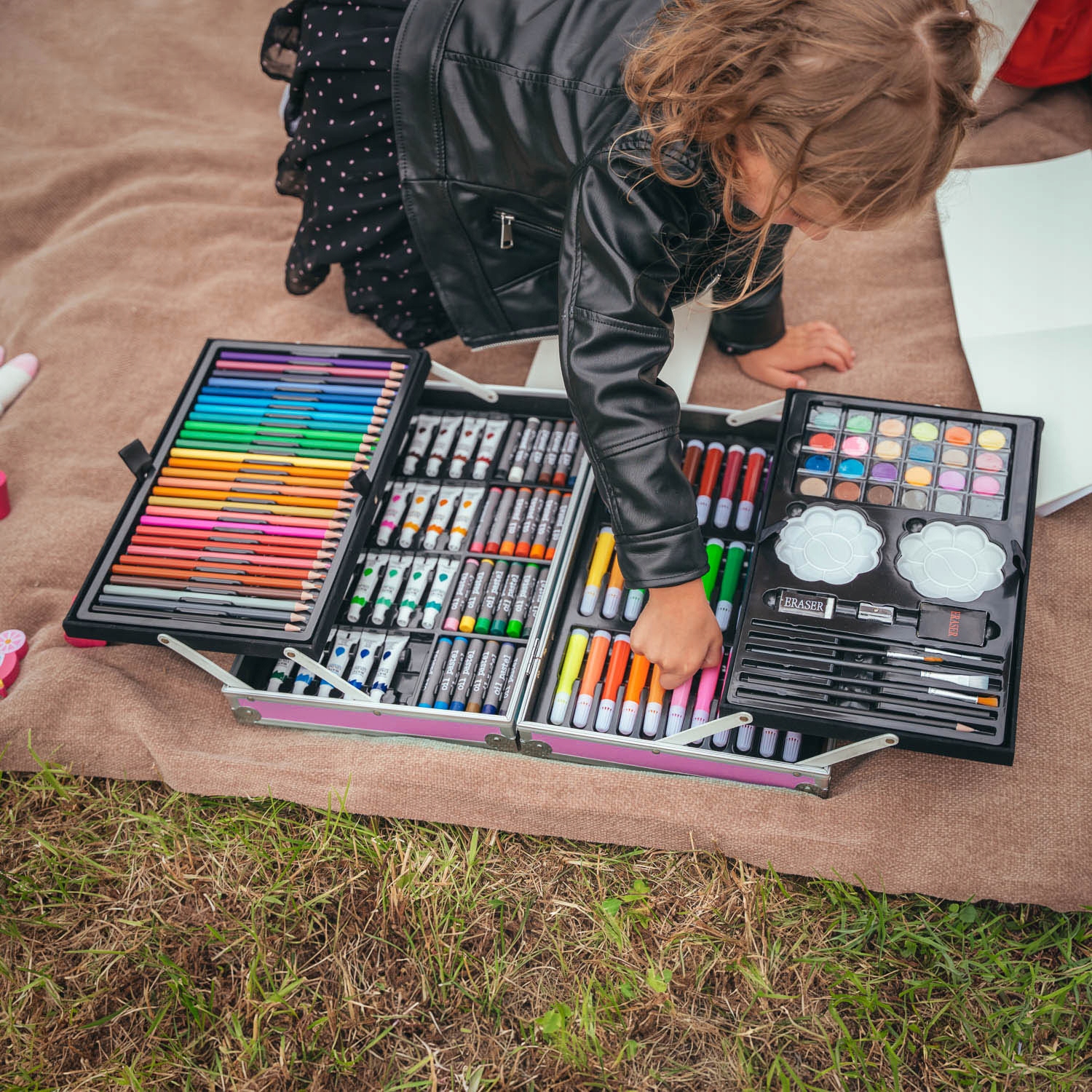 Kredki, farbki, pastele, mazaki i akcesoria – wszystko zamknięte w kolorowej walizce z przegródkami, dzięki czemu dziecko łatwo zachowa porządek i zabierze zestaw gdzie tylko chce.