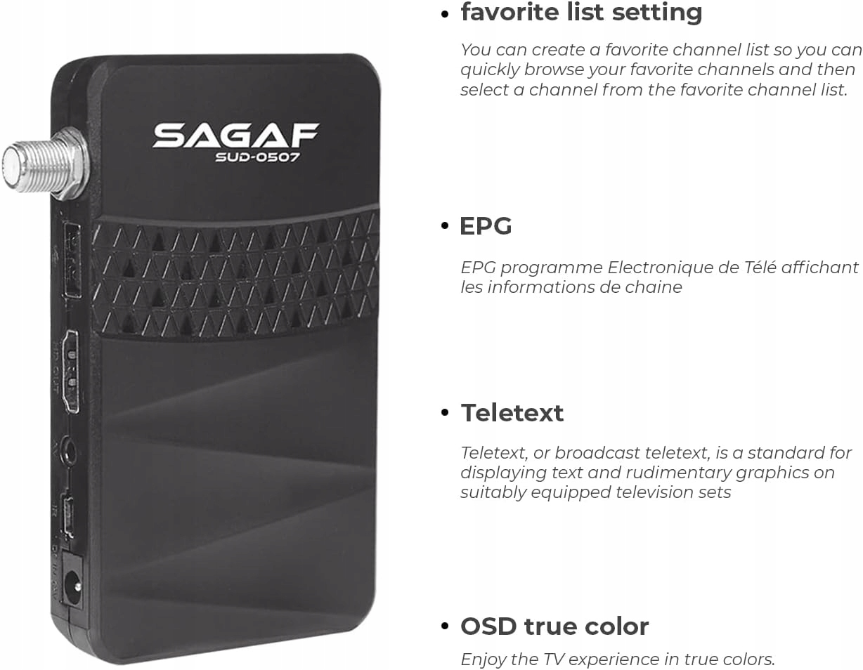 Stylowe wzornictwo: Sagaf SUD-0507 został zaprojektowany, aby zapewnić Ci najlepsze wrażenia. Urządzenie wyprodukowane przy użyciu zaawansowanych technologicznie maszyn zachwyca wzornictwem i wydajnością. Zajmuje mniej miejsca w porównaniu z innymi urządzeniami, a jego elegancki design sprawia, że urządzenie jest bardzo preferowane.