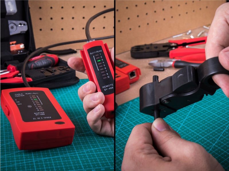 Szybkie testowanie sygnału kablowego na miejscu dzięki automatycznie skanującemu urządzeniu testowemu i oddzielnemu modułowi zdalnemu. Do kabli Ethernet LAN RJ45 i kabli telefonicznych RJ11. Złącza: Cat 5, Cat 5e, Cat 6, Cat 7, RJ11 6P i RJ45 8P